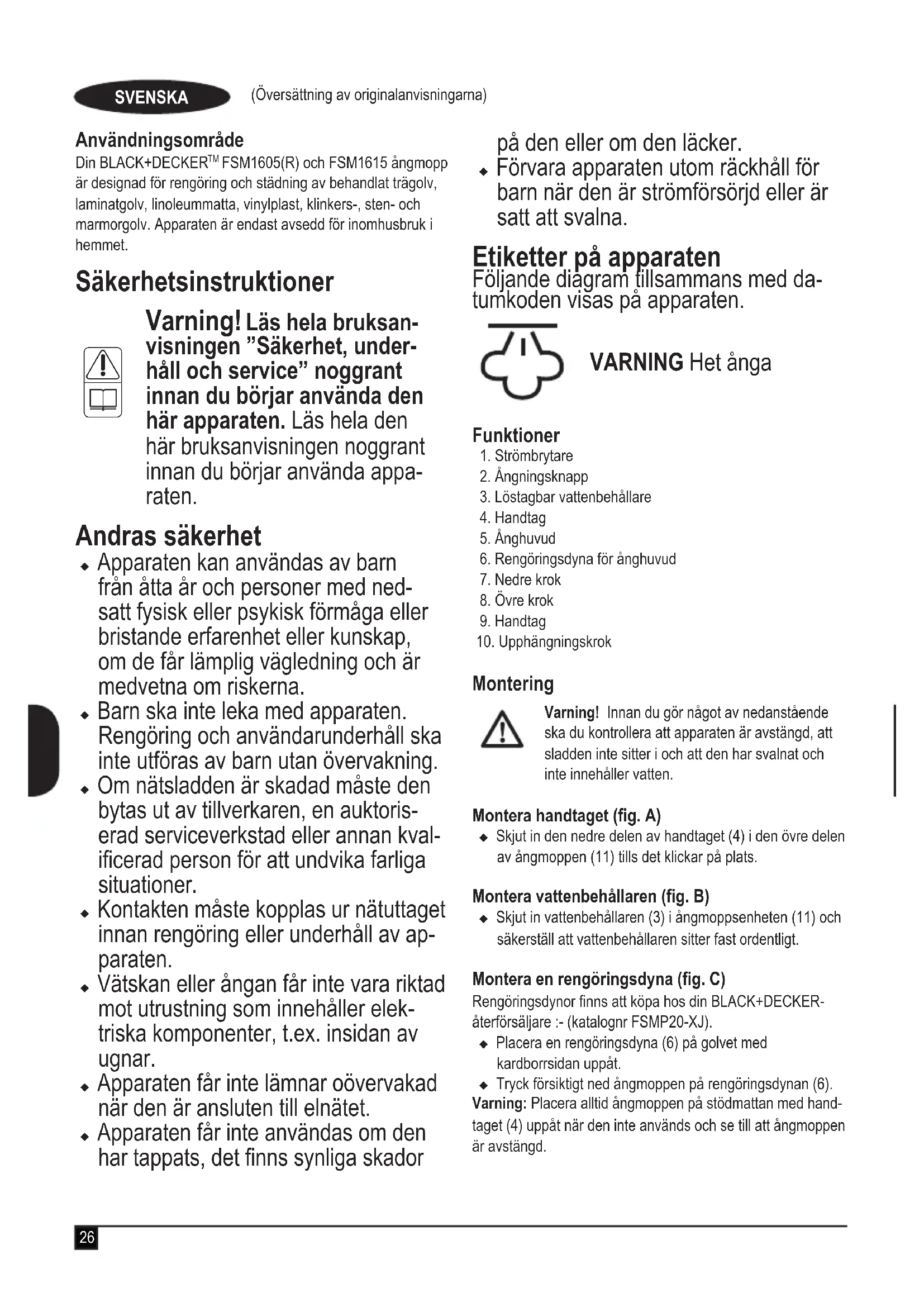 Varning! Läs hela bruksan- visningen ”Säkerhet, under- håll och service” noggrant innan du börjar använda den här apparaten. Läs hela den här bruksanvisningen noggrant innan du börjar använda appa- raten. Andras säkerhet u Apparaten kan användas av barn från åtta år och personer med ned- satt fysisk eller psykisk förmåga eller bristande erfarenhet eller kunskap, om de får lämplig vägledning och är medvetna om riskerna. u Barn ska inte leka med apparaten. Rengöring och användarunderhåll ska inte utföras av barn utan övervakning. u Om nätsladden är skadad måste den bytas ut av tillverkaren, en auktoris- erad serviceverkstad eller annan kval- icerad person för att undvika farliga situationer. u Kontakten måste kopplas ur nätuttaget innan rengöring eller underhåll av ap- paraten. u Vätskan eller ångan får inte vara riktad mot utrustning som innehåller elek- triska komponenter, t.ex. insidan av ugnar. u Apparaten får inte lämnar oövervakad när den är ansluten till elnätet. u Apparaten får inte användas om den har tappats, det nns synliga skador på den eller om den läcker. u Förvara apparaten utom räckhåll för barn när den är strömförsörjd eller är satt att svalna. Etiketter på apparaten Följande diagram tillsammans med da- tumkoden visas på apparaten. VARNING Het ånga Funktioner 1. Strömbrytare 2. Ångningsknapp 3. Löstagbar vattenbehållare 4. Handtag 5. Ånghuvud 6. Rengöringsdyna för ånghuvud 7. Nedre krok 8. Övre krok 9. Handtag 10. Upphängningskrok Montering Varning! Innan du gör något av nedanstående ska du kontrollera att apparaten är avstängd, att sladden inte sitter i och att den har svalnat och inte innehåller vatten. Montera handtaget (g. A) u Skjut in den nedre delen av handtaget (4) i den övre delen av ångmoppen (11) tills det klickar på plats. Montera vattenbehållaren (g. B) u Skjut in vattenbehållaren (3) i ångmoppsenheten (11) och säkerställ att vattenbehållaren sitter fast ordentligt. Montera en rengöringsdyna (g. C) Rengöringsdynor nns att köpa hos din BLACK+DECKER-återförsäljare :- (katalognr FSMP20-XJ).u Placera en rengöringsdyna (6) på golvet med kardborrsidan uppåt.u Tryck försiktigt ned ångmoppen på rengöringsdynan (6).Varning: Placera alltid ångmoppen på stödmattan med hand-taget (4) uppåt när den inte används och se till att ångmoppen är avstängd.27 (Översättning av originalanvisningarna) SVENSKA Avlägsna en rengöringsdyna Varning! Använd alltid lämpliga skor när du byter rengörings- dyna på ångmoppen. Använd inte tofor eller öppna skor. u Sätt tillbaka handtaget (4) i upprätt läge och stäng AV ångmoppen. u Vänta tills ångmoppen har svalnat (cirka 5 minuter). u Lyft upp ångmoppen från rengöringsdynan så att den släp- per från kardborrfästet. Varning! Placera alltid ångmoppen på stödmattan med hand- taget (4) uppåt när den inte används och se till att ångmoppen är avstängd. Fylla vattenbehållaren (g. D) Ångmoppens vattenbehållare är löstagbar för enkel och bekväm påfyllning. Obs! Fyll vattenbehållaren med rent kranvatten. Obs! I områden med hårt vatten rekommenderas att du använder avjoniserat vatten. u Avlägsna vattenbehållaren (3). u Avlägsna påfyllningslocket genom att skruva det moturs. u Fyll behållaren (3) med vatten. Varning! Vattenbehållaren rymmer 350 ml. Fyll inte på för mycket vatten i vattenbehållaren. u Sätt fast påfyllningslocket genom att skruva det medurs. u Sätt tillbaka vattenbehållaren (3). Obs! Kontrollera att påfyllningslocket sitter fast ordentligt. Obs! Använd inte kemiska rengöringsmedel i ångmoppens vattenbehållare. Användning Viktigt! Den här apparaten dödar 99,9% av alla bakterier om den används enligt anvisningarna i den här manualen med mikroberdynan monterad och en kontinuerlig körtid på 90 sekunder. Slå på och av u Starta apparaten genom att trycka på PÅ-/AV-knappen (1). Det tar cirka 15 sekunder för ångmoppen att värmas upp. u Tryck på ångningsknappen (2). Detta försätter pumpen i driftläge och enheten börjar producera ånga. u För att stoppa ångproduktionen sätter du ångningsknap- pen (2) i läget AV. På så vis avbryts inte strömförsörjnin- gen till pannan, så att det går snabbare att starta. u Stäng av apparaten genom att trycka på PÅ/AV-knappen (1). Varning! Lämna aldrig ångmoppen på samma plats på ytan under längre tid. Placera alltid ångmoppen på stödmattan med handtaget (4) uppåt när den inte används och se till att den är avstängd. Varning! Töm alltid ångmoppen när du är klar. Obs! När du fyller på vatten för första gången eller när vattnet har tagit slut kan det ta upp till 45 sekunder innan ånga bildas. Tips för optimal användning Allmänt Varning: Använd aldrig ångmoppen utan att först montera en rengöringsdyna. u Dammsug eller sopa golvet innan du använder ångmop- pen. u Det enklaste sättet att använda apparaten är att luta handtaget 45° och sedan försiktigt och långsamt rengöra en liten yta åt gången. u Använd inte kemiska rengöringsmedel med ångmoppen. Om du ska ta bort besvärliga äckar från vinyl- eller linole- umgolv kan du förbehandla med ett milt rengöringsmedel innan du använder ångmoppen. Ångrengöring u Placera en rengöringsdyna (6) på golvet med kardborrsidan uppåt. u Tryck försiktigt ned ångmoppen på rengöringsdynan (6). u Anslut ångmoppen till elnätet. u Tryck på strömbrytaren (1). Det tar cirka 15 sekunder för ångmoppen att värmas upp. u Tryck på ångningsknappen (2). Efter några sekunder börjar ånga att strömma ut ur ånghuvudet. Obs! När du fyller på vatten för första gången eller när vattnet har tagit slut kan det ta upp till 45 sekunder innan ånga bildas. u Det tar några sekunder för ångan att komma in i rengöringsdynan. Ångmoppen glider nu lätt över ytan som ska saneras/rengöras. u Skjut och dra ångmoppen försiktigt f