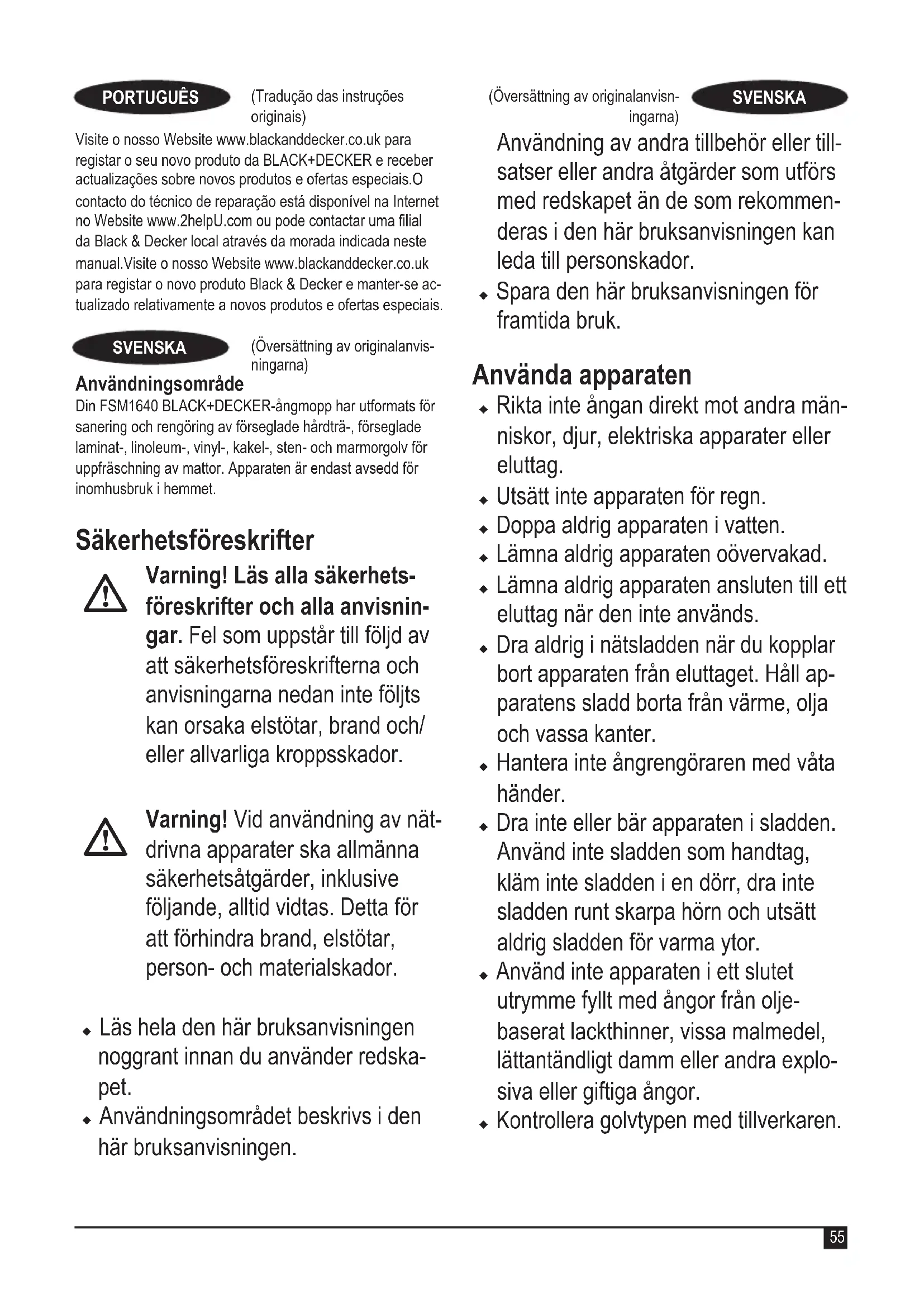 Effekt W Behållarens kapacitet ml Vikt kg 3.4 Garanti Black & Decker är säker på kvaliteten hos denna produkt och erbjuder kunder 24 månaders garanti från inköpsdatumet. Denna garanti är ett tillägg till dina lagstadgade rättigheter och påverkar inte dessa på något sätt. Garantin är giltig i de områden som tillhör medlemsstaterna i Europeiska unionen, det europeiska frihandelsområdet samt Storbritannien.För yrkande under garantin måste yrkandet vara in enlighet med Black & Deckers villkor och du kommer att behöva skicka in bevis på köpet till försäljaren eller en auktoriserad reparatör. Villkoren för Black & Deckers tvååriga garanti och var du hittar din närmaste auktoriserade reparatör kan erhållas på internet på www.2helpU.com, eller genom att kontakta ditt lokal Black & Decker kontor på adressen som angetts i denna bruksanvisning. PBesök vår webbplats www.blackanddecker.se för att registrera din nya Black & Decker-produkt samt för att få information om nya produkter och specialerbjudanden.Reparatör kan erhållas på internet på www.2helpU.com, eller genom att kontakta ditt lokal Black & Decker kontor på adres-sen som angetts i denna bruksanvisning.Besök vår webbplats www.blackanddecker.se för att registrera din nya Black & Decker-produkt samt för att få information om nya produkter och specialerbjudanden. Bruksområde Dampmoppen fra BLACK+DECKER FSM1640 er utformet for å rense og rengjøre gulv med forseglet hardtre, forseglet lami-nat, linoleum, vinyl, keramiske iser, stein og marmor og for å oppfriske tepper. Produktet er bare beregnet for innendørs bruk i hjemmet. Sikkerhetsinstruksjoner