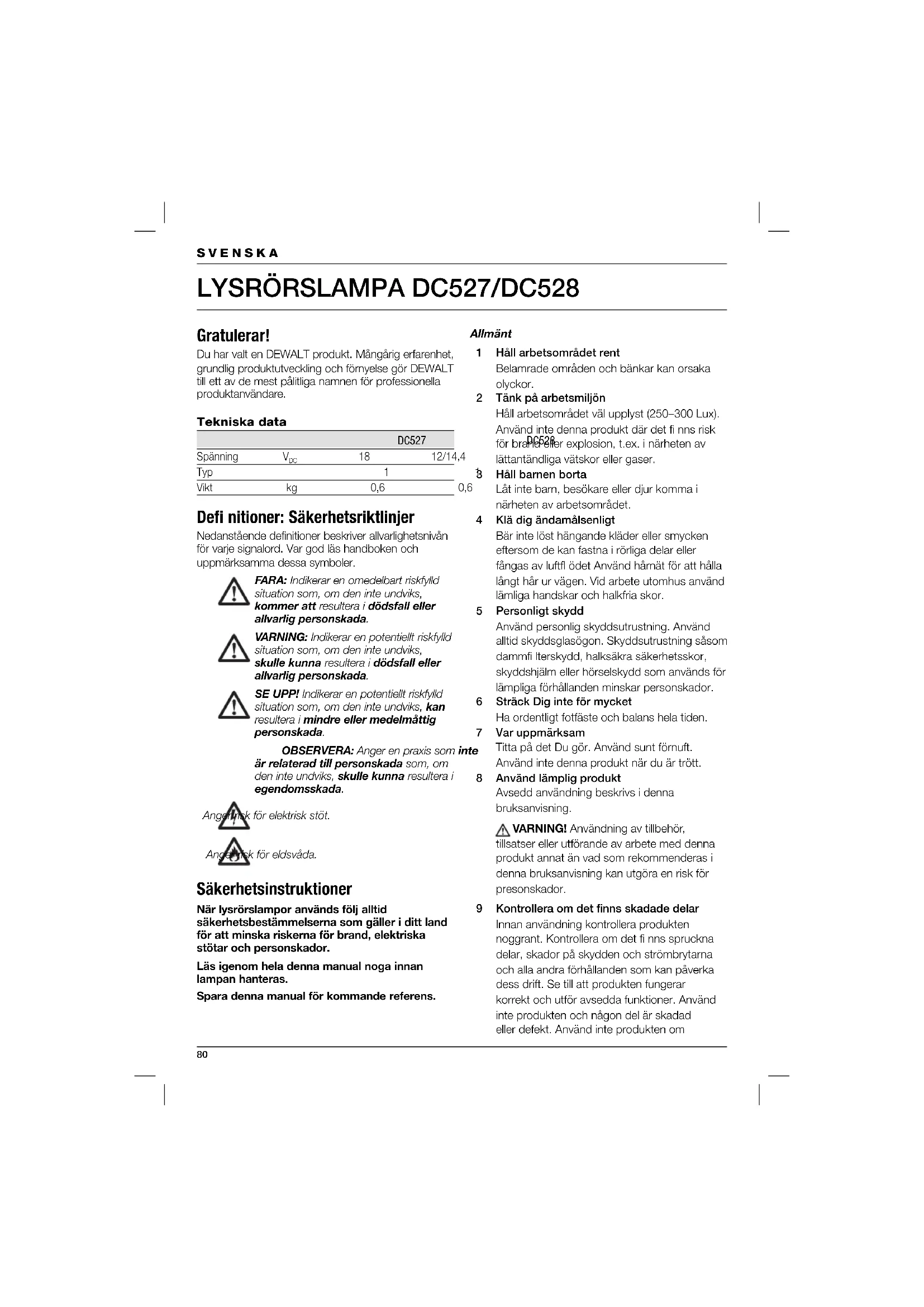 18 12/14,4 Typ 1 1 Vikt kg 0,6 0,6 Defi nitioner: Säkerhetsriktlinjer Nedanstående definitioner beskriver allvarlighetsnivån för varje signalord. Var god läs handboken och uppmärksamma dessa symboler. FARA: Indikerar en omedelbart riskfylld situation som, om den inte undviks, kommer att resultera i dödsfall eller allvarlig personskada. VARNING: Indikerar en potentiellt riskfylld situation som, om den inte undviks, skulle kunna resultera i dödsfall eller allvarlig personskada. SE UPP! Indikerar en potentiellt riskfylld situation som, om den inte undviks, kan resultera i mindre eller medelmåttig personskada. OBSERVERA: Anger en praxis som inte är relaterad till personskada som, om den inte undviks, skulle kunna resultera i egendomsskada. Anger risk för elektrisk stöt. Anger risk för eldsvåda. Säkerhetsinstruktioner När lysrörslampor används följ alltid säkerhetsbestämmelserna som gäller i ditt land för att minska riskerna för brand, elektriska stötar och personskador. Läs igenom hela denna manual noga innan lampan hanteras. Spara denna manual för kommande referens. Allmänt 1 Håll arbetsområdet rent Belamrade områden och bänkar kan orsaka olyckor. 2 Tänk på arbetsmiljön Håll arbetsområdet väl upplyst (250–300 Lux). Använd inte denna produkt där det fi nns risk för brand eller explosion, t.ex. i närheten av lättantändliga vätskor eller gaser. 3 Håll barnen borta Låt inte barn, besökare eller djur komma i närheten av arbetsområdet. 4 Klä dig ändamålsenligt Bär inte löst hängande kläder eller smycken eftersom de kan fastna i rörliga delar eller fångas av luftfl ödet Använd hårnät för att hålla långt hår ur vägen. Vid arbete utomhus använd lämliga handskar och halkfria skor. 5 Personligt skydd Använd personlig skyddsutrustning. Använd alltid skyddsglasögon. Skyddsutrustning såsom dammfi lterskydd, halksäkra säkerhetsskor, skyddshjälm eller hörselskydd som används för lämpliga förhållanden minskar personskador. 6 Sträck Dig inte för mycket Ha ordentligt fotfäste och balans hela tiden. 7 Var uppmärksam Titta på det Du gör. Använd sunt förnuft. Använd inte denna produkt när du är trött. 8 Använd lämplig produkt Avsedd användning beskrivs i denna bruksanvisning. VARNING! Användning av tillbehör, tillsatser eller utförande av arbete med denna produkt annat än vad som rekommenderas i denna bruksanvisning kan utgöra en risk för presonskador. 9 Kontrollera om det fi nns skadade delar Innan användning kontrollera produkten noggrant. Kontrollera om det fi nns spruckna delar, skador på skydden och strömbrytarna och alla andra förhållanden som kan påverka dess drift. Se till att produkten fungerar korrekt och utför avsedda funktioner. Använd inte produkten och någon del är skadad eller defekt. Använd inte produkten om81 strömbrytaren inte kan slås på eller stängas av. Skadade eller defekta strömbrytare måste bytas hos ett auktoriserat DEWALT serviceverkstad. Försök inte göra några reparationer själv. 10 Ta bort batteripaketet Ta bort batteripaketet när produkten inte används, innan byte av några delar på produkten, tillbehör eller tillsatser och innan service. 11 Förvaring När produkten inte används skall den förvaras på ett torrt, högt placerat ställe, inlåst, utom räckhåll för barn. 12 Underhåll och vårda produkten Håll produkten i gott skick och väl rengjort för bättre och säkrare prestanda. Följ instruktionerna för underhåll och byte av tillbehör. Se till att handtagen och strömbrytarna är torra och fria från olja och fett. 13 Reparationer Denna produkt uppfyller relevanta säkerhetsbestämmelser. Låt din produkt repareras av en auktoriserad D EWALT serviceverkstad. Reparationer bör endast utföras av kvalifi cerade personer som använder originalreservdelar, i annat fall kan det resultera i allvarlig fara för användaren. Tillkommande säkerhetsanvisningar för lysrör