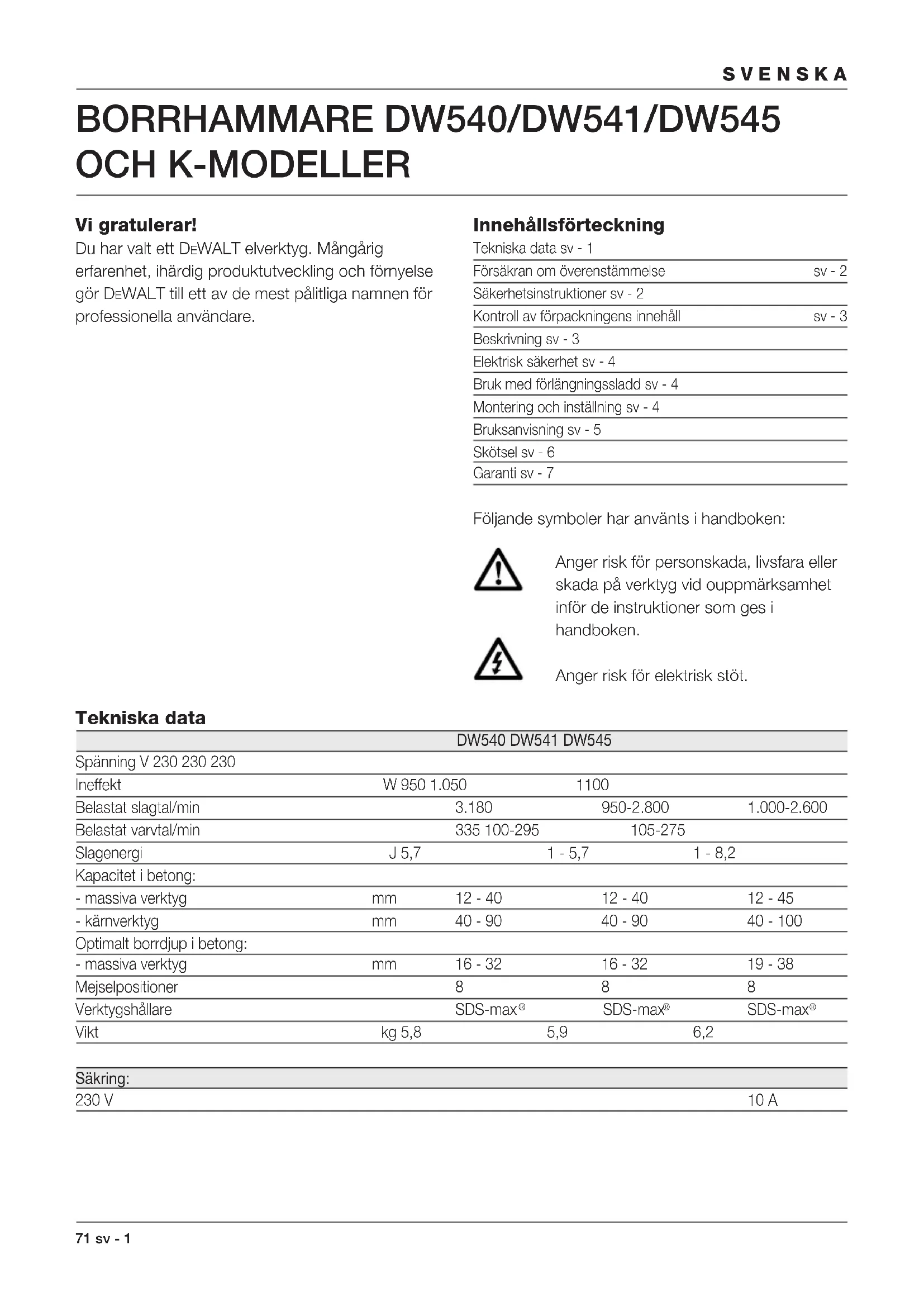 OCH K-MODELLER Vi gratulerar! Du har valt ett DEWALT elverktyg. Mångårig erfarenhet, ihärdig produktutveckling och förnyelse gör DEWALT till ett av de mest pålitliga namnen för professionella användare. Innehållsförteckning Tekniska data sv - 1 Försäkran om överenstämmelse sv - 2 Säkerhetsinstruktioner sv - 2 Kontroll av förpackningens innehåll sv - 3 Beskrivning sv - 3 Elektrisk säkerhet sv - 4 Bruk med förlängningssladd sv - 4 Montering och inställning sv - 4 Bruksanvisning sv - 5 Skötsel sv - 6 Garanti sv - 7 Följande symboler har använts i handboken: Anger risk för personskada, livsfara eller skada på verktyg vid ouppmärksamhet inför de instruktioner som ges i handboken. Anger risk för elektrisk stöt. Tekniska data DW540 DW541 DW545 Spänning V 230 230 230 Ineffekt W 950 1.050 1100 Belastat slagtal/min 3.180 950-2.800 1.000-2.600 Belastat varvtal/min 335 100-295 105-275 Slagenergi J 5,7 1 - 5,7 1 - 8,2 Kapacitet i betong: - massiva verktyg mm 12 - 40 12 - 40 12 - 45 - kärnverktyg mm 40 - 90 40 - 90 40 - 100 Optimalt borrdjup i betong: - massiva verktyg mm 16 - 32 16 - 32 19 - 38 Mejselpositioner 8 8 8 Verktygshållare SDS-max