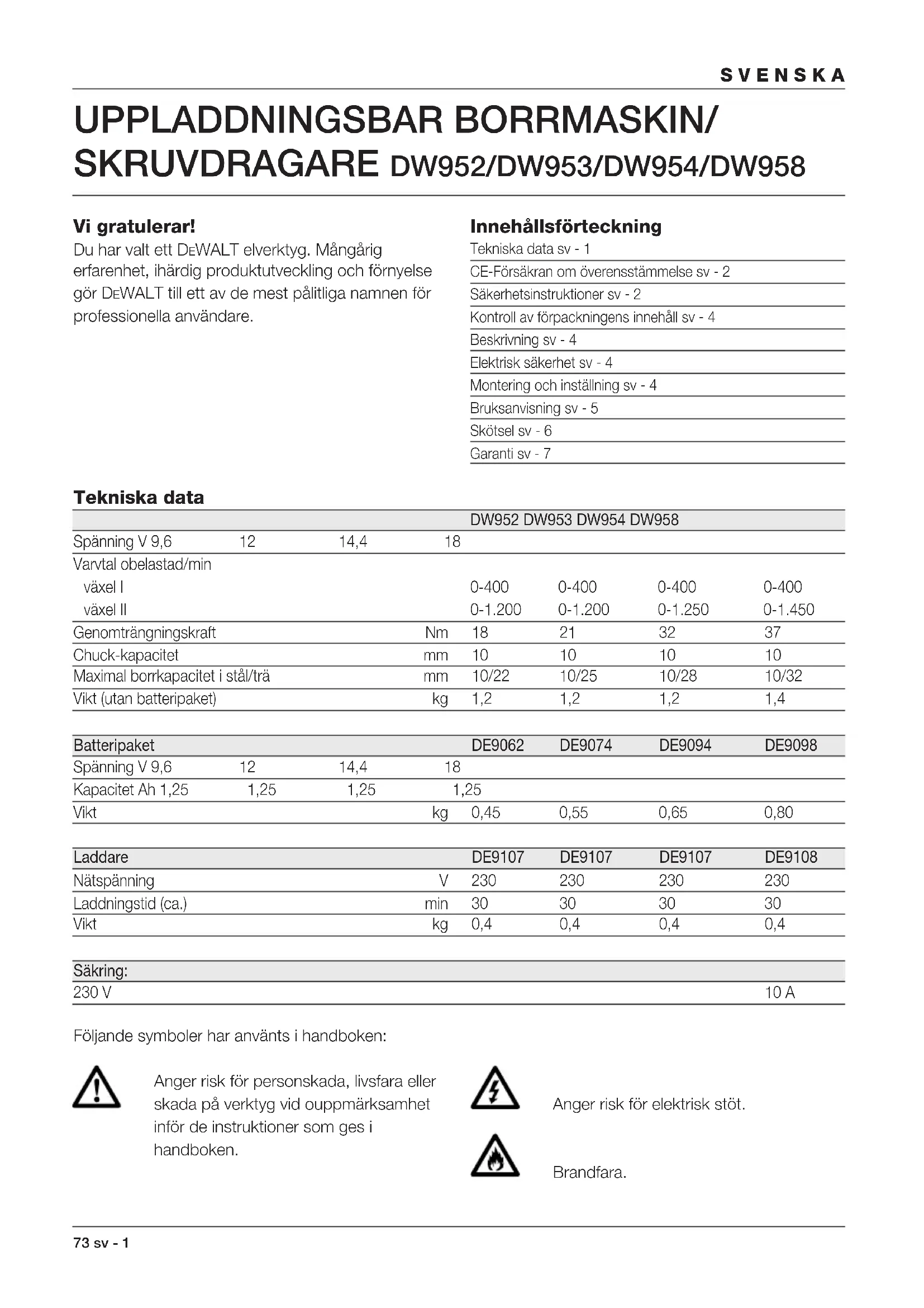 Vi gratulerar! Du har valt ett DEWALT elverktyg. Mångårig erfarenhet, ihärdig produktutveckling och förnyelse gör DEWALT till ett av de mest pålitliga namnen för professionella användare. Innehållsförteckning Tekniska data sv - 1 CE-Försäkran om överensstämmelse sv - 2 Säkerhetsinstruktioner sv - 2 Kontroll av förpackningens innehåll sv - 4 Beskrivning sv - 4 Elektrisk säkerhet sv - 4 Montering och inställning sv - 4 Bruksanvisning sv - 5 Skötsel sv - 6 Garanti sv - 7 Tekniska data DW952 DW953 DW954 DW958 Spänning V 9,6 12 14,4 18 Varvtal obelastad/min växel I 0-400 0-400 0-400 0-400 växel II 0-1.200 0-1.200 0-1.250 0-1.450 Genomträngningskraft Nm 18 21 32 37 Chuck-kapacitet mm 10 10 10 10 Maximal borrkapacitet i stål/trä mm 10/22 10/25 10/28 10/32 Vikt (utan batteripaket) kg 1,2 1,2 1,2 1,4 Batteripaket DE9062 DE9074 DE9094 DE9098 Spänning V 9,6 12 14,4 18 Kapacitet Ah 1,25 1,25 1,25 1,25 Vikt kg 0,45 0,55 0,65 0,80 Laddare DE9107 DE9107 DE9107 DE9108 Nätspänning V 230 230 230 230 Laddningstid (ca.) min 30 30 30 30 Vikt kg 0,4 0,4 0,4 0,4 Säkring: 230 V 10 A Följande symboler har använts i handboken: Anger risk för personskada, livsfara eller skada på verktyg vid ouppmärksamhet inför de instruktioner som ges i handboken. Anger risk för elektrisk stöt. Brandfara.SVENSKA sv - 2 74 CE-Försäkran om överensstämmelse DW952/DW953/DW954/DW958 DEWALT förklarar att dessa elverktyg är konstruerade i överensstämmelse med följande normer: 89/392/EEG, 89/336/EEG, 73/23/EEG, EN 50144, EN 55104 / EN 55014-2, EN 55014, EN 61000-3-2 & EN 61000-3-3. För mer information ombeds ni kontakta DEWALT på nedanstående adress eller se baksidan av manualen. Ljudnivån överensstämmer med Europeiska Gemenskapens bestämmelser 86/188/EEG & 89/392/EEG, uppmätt enligt EN 50144: DW952 DW953 DW954 DW958