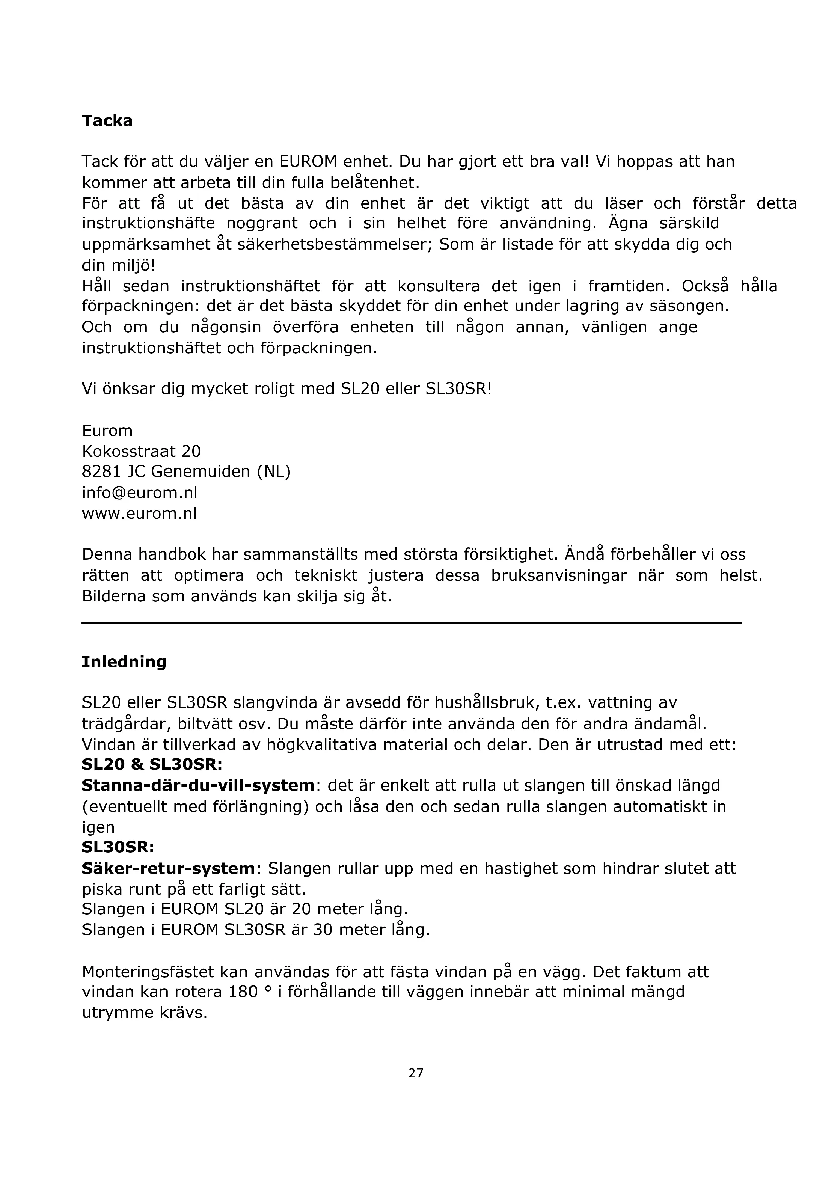 Inledning SL20 eller SL30SR slangvinda är avsedd för hushållsbruk, t.ex. vattning av trädgårdar, biltvätt osv. Du måste därför inte använda den för andra ändamål. Vindan är tillverkad av högkvalitativa material och delar. Den är utrustad med ett: SL20 & SL30SR: Stanna-där-du-vill-system: det är enkelt att rulla ut slangen till önskad längd (eventuellt med förlängning) och låsa den och sedan rulla slangen automatiskt in igen SL30SR: Säker-retur-system: Slangen rullar upp med en hastighet som hindrar slutet att piska runt på ett farligt sätt. Slangen i EUROM SL20 är 20 meter lång. Slangen i EUROM SL30SR är 30 meter lång. Monteringsfästet kan användas för att fästa vindan på en vägg. Det faktum att vindan kan rotera 180 ° i förhållande till väggen innebär att minimal mängd utrymme krävs.28 Tekniska data Modell SL20 SL30SR Slangens längd 20 m 30 m Slangmaterial PVC PVC Material hölje