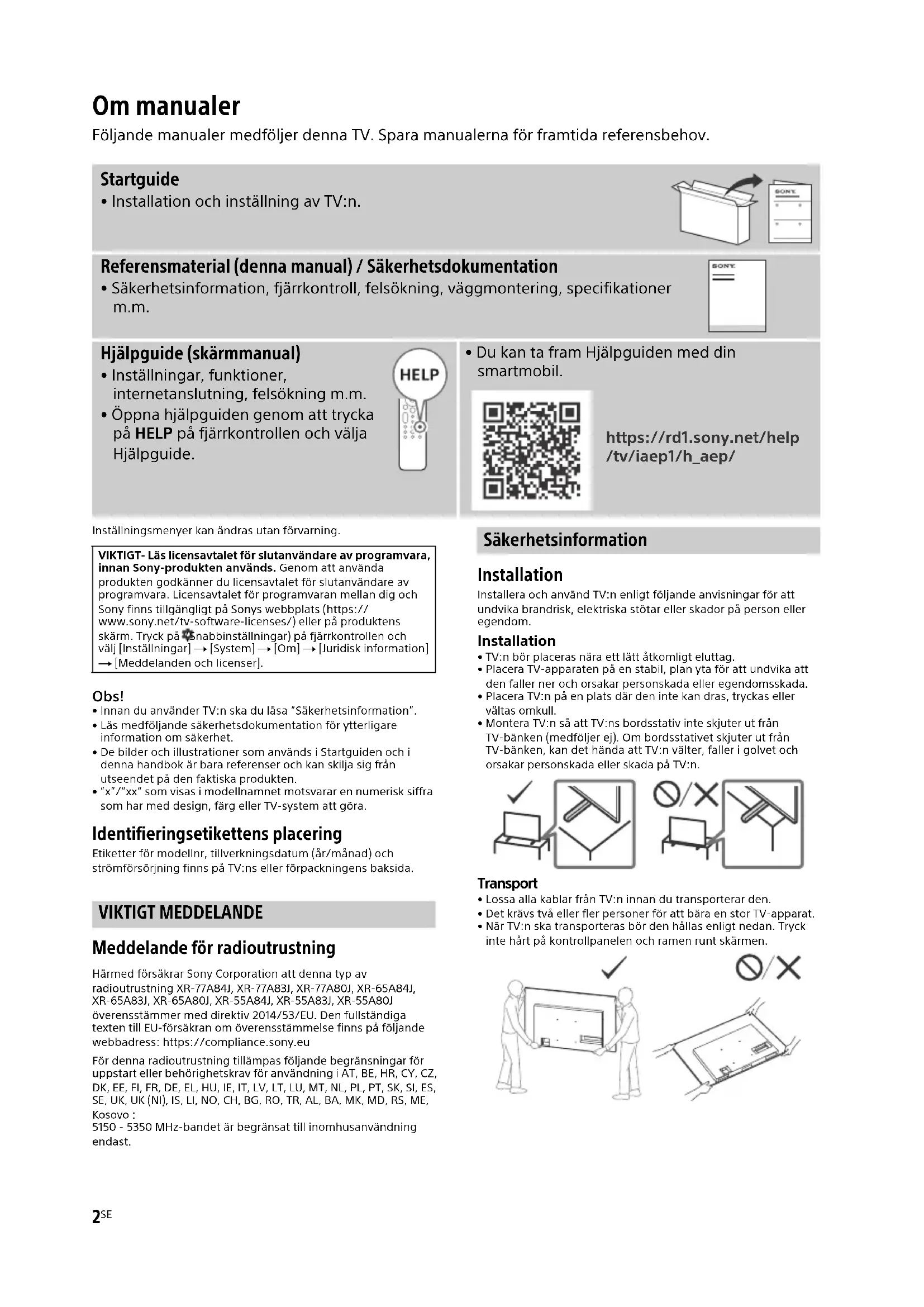 - Innan du använder TV:n ska du läsa ”Säkerhetsinformation”.• Läs medföljande säkerhetsdokumentation för ytterligare information om säkerhet.• De bilder och illustrationer som används i Startguiden och i denna handbok är bara referenser och kan skilja sig från utseendet på den faktiska produkten.• ”x”/”xx” som visas i modellnamnet motsvarar en numerisk siffra som har med design, färg eller TV-system att göra. Identifieringsetikettens placering Etiketter för modellnr, tillverkningsdatum (år/månad) och strömförsörjning finns på TV:ns eller förpackningens baksida. VIKTIGT MEDDELANDE Meddelande för radioutrustning Härmed försäkrar Sony Corporation att denna typ av radioutrustning XR-77A84J, XR-77A83J, XR-77A80J, XR-65A84J, XR-65A83J, XR-65A80J, XR-55A84J, XR-55A83J, XR-55A80J överensstämmer med direktiv 2014/53/EU. Den fullständiga texten till EU-försäkran om överensstämmelse finns på följande webbadress: https://compliance.sony.euFör denna radioutrustning tillämpas följande begränsningar för uppstart eller behörighetskrav för användning i AT, BE, HR, CY, CZ, DK, EE, FI, FR, DE, EL, HU, IE, IT, LV, LT, LU, MT, NL, PL, PT, SK, SI, ES, SE, UK, UK (NI), IS, LI, NO, CH, BG, RO, TR, AL, BA, MK, MD, RS, ME, Kosovo :5150 - 5350 MHz-bandet är begränsat till inomhusanvändning endast. Säkerhetsinformation Installation Installera och använd TV:n enligt följande anvisningar för att undvika brandrisk, elektriska stötar eller skador på person eller egendom. Installation