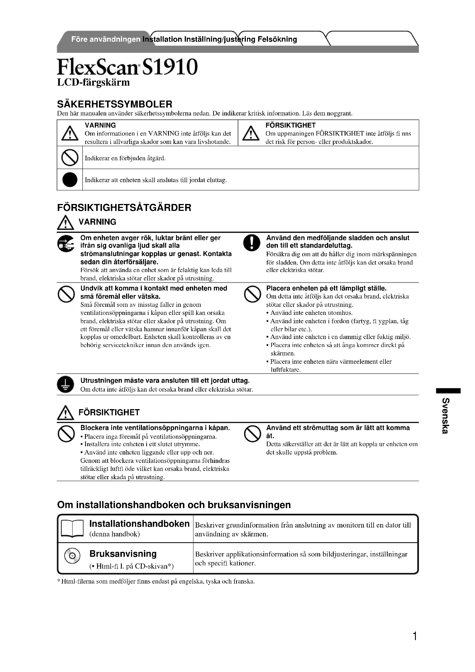 VARNING Om enheten avger rök, luktar bränt eller ger ifrån sig ovanliga ljud skall alla strömanslutningar kopplas ur genast. Kontakta sedan din återförsäljare.Försök att använda en enhet som är felaktig kan leda till brand, elektriska stötar eller skador på utrustning.Använd den medföljande sladden och anslut den till ett standardeluttag.Försäkra dig om att du håller dig inom märkspänningen för sladden. Om detta inte åtföljs kan det orsaka brand eller elektriska stötar.Undvik att komma i kontakt med enheten med små föremål eller vätska.Små föremål som av misstag faller in genom ventilationsöppningarna i kåpan eller spill kan orsaka brand, elektriska stötar eller skador på utrustning. Om ett föremål eller vätska hamnar innanför kåpan skall det kopplas ur omedelbart. Enheten skall kontrolleras av en behörig servicetekniker innan den används igen.Placera enheten på ett lämpligt ställe.Om detta inte åtföljs kan det orsaka brand, elektriska stötar eller skador på utrustning.• Använd inte enheten utomhus.• Använd inte enheten i fordon (fartyg, fl ygplan, tåg eller bilar etc.).• Använd inte enheten i en dammig eller fuktig miljö.• Placera inte enheten så att ånga kommer direkt på skärmen.• Placera inte enheten nära värmeelement eller luftfuktare.Utrustningen måste vara ansluten till ett jordat uttag.Om detta inte åtföljs kan det orsaka brand eller elektriska stötar. FÖRSIKTIGHET Blockera inte ventilationsöppningarna i kåpan.• Placera inga föremål på ventilationsöppningarna.• Installera inte enheten i ett slutet utrymme.• Använd inte enheten liggande eller upp och ner.Genom att blockera ventilationsöppningarna förhindras tillräckligt luftfl öde vilket kan orsaka brand, elektriska stötar eller skada på utrustning.Använd ett strömuttag som är lätt att komma åt. Detta säkerställer att det är lätt att koppla ur enheten om det skulle uppstå problem. LCD-färgskärm Före användningen Installation Inställning/justering Felsökning Om installationshandboken och bruksanvisningen Installationshandboken (denna handbok)Beskriver grundinformation från anslutning av monitorn till en dator till användning av skärmen. Bruksanvisning (• Html-fi l. på CD-skivan*)Beskriver applikationsinformation så som bildjusteringar, inställningar och specifi kationer.