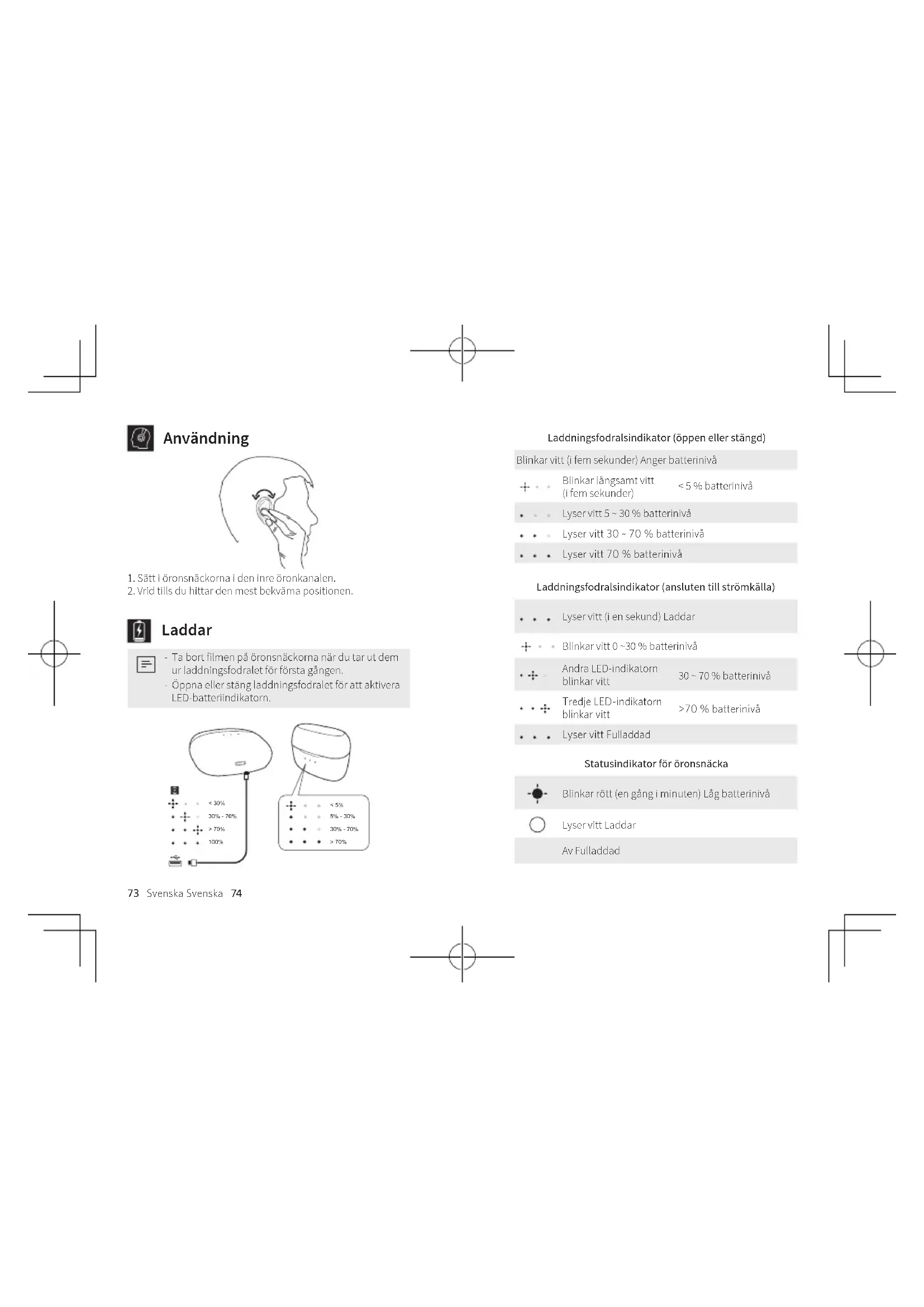 Laddar - Ta bort filmen på öronsnäckorna när du tar ut dem ur laddningsfodralet för första gången. - Öppna eller stäng laddningsfodralet för att aktivera LED-batteriindikatorn. < 30% 30% - 70% > 70% 100% 5% - 30% < 5% 30% - 70% > 70% Laddningsfodralsindikator (öppen eller stängd) Blinkar vitt (i fem sekunder) Anger batterinivå Blinkar långsamt vitt (i fem sekunder) < 5 % batterinivå Lyser vitt 5 ~ 30 % batterinivå Lyser vitt 30 ~ 70 % batterinivå Lyser vitt 70 % batterinivå Laddningsfodralsindikator (ansluten till strömkälla) Lyser vitt (i en sekund) Laddar Blinkar vitt 0 ~30 % batterinivå Andra LED-indikatorn blinkar vitt 30 ~ 70 % batterinivå Tredje LED-indikatorn blinkar vitt >70 % batterinivå Lyser vitt Fulladdad Statusindikator för öronsnäcka Blinkar rött (en gång i minuten) Låg batterinivå Lyser vitt Laddar Av Fulladdad75 Svenska Svenska 76 Ladda fullt minst en gång var 45:e dag för att bevara batteriets livslängd. Slå av/på