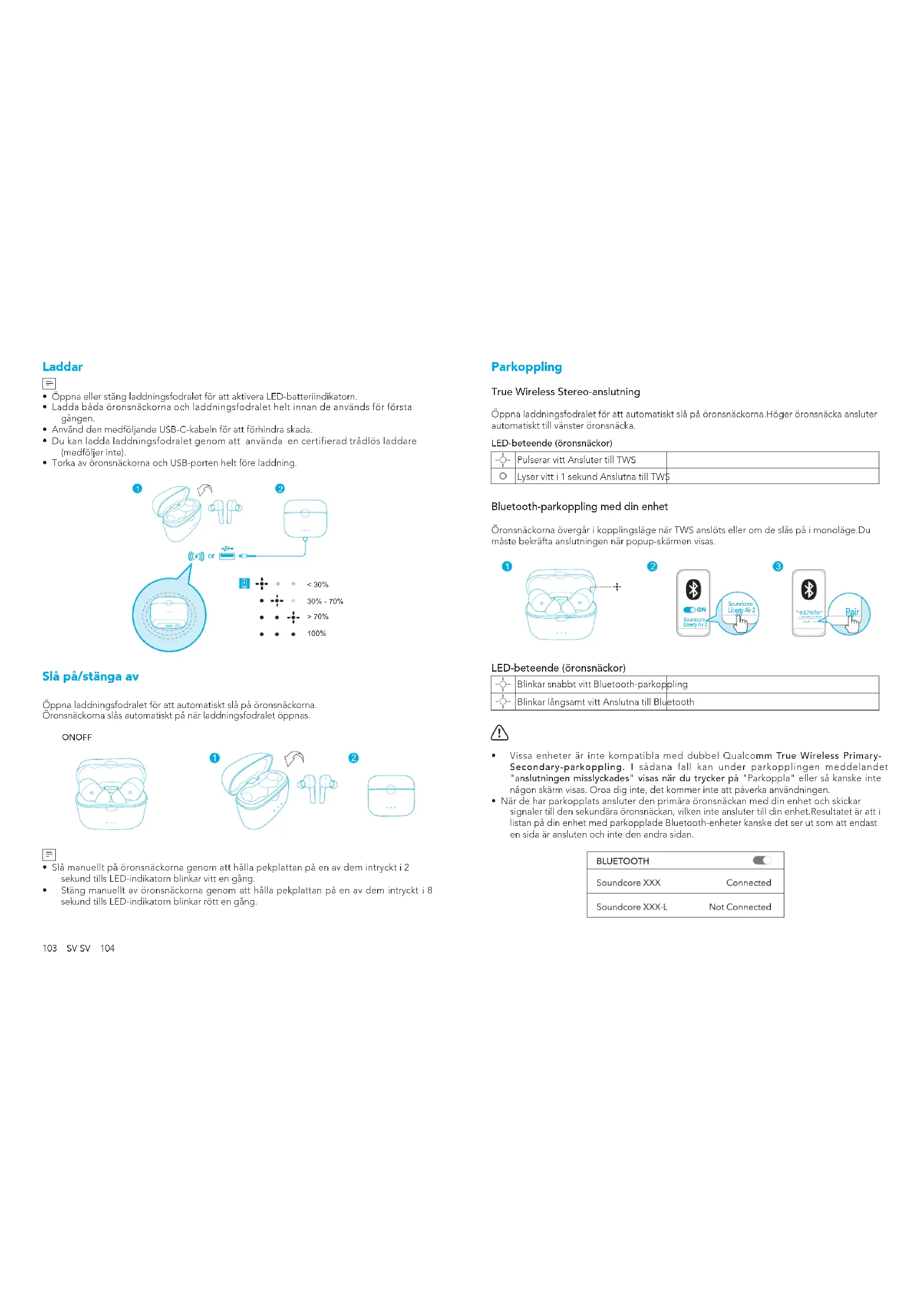 - När de har parkopplats ansluter den primära öronsnäckan med din enhet och skickar signaler till den sekundära öronsnäckan, vilken inte ansluter till din enhet.Resultatet är att i listan på din enhet med parkopplade Bluetooth-enheter kanske det ser ut som att endast en sida är ansluten och inte den andra sidan.105 SV SV 106 Koppla till en annan Bluetooth-enhet genom att placera öronsnäckorna i laddningsfodralet och kontrollera att de laddas, håll sedan locket öppet och håll knappen på undersidan av laddningsfodralet intryckt i 3 sekunder tills LED-indikatorerna på öronsnäckorna blinkar snabbt vitt.