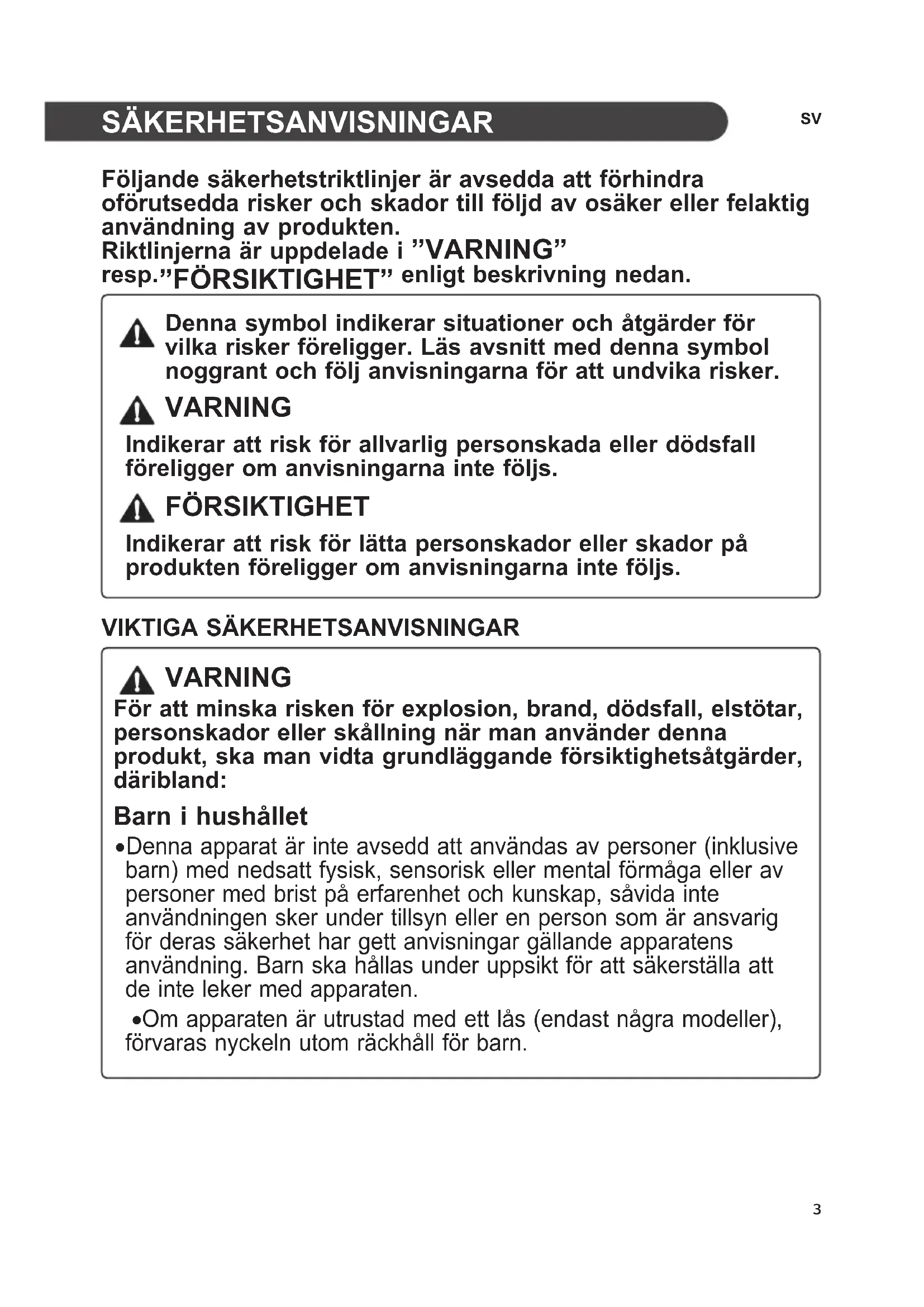VARNING För att minska risken för explosion, brand, dödsfall, elstötar, personskador eller skållning när man använder denna produkt, ska man vidta grundläggande försiktighetsåtgärder, däribland: Barn i hushållet
