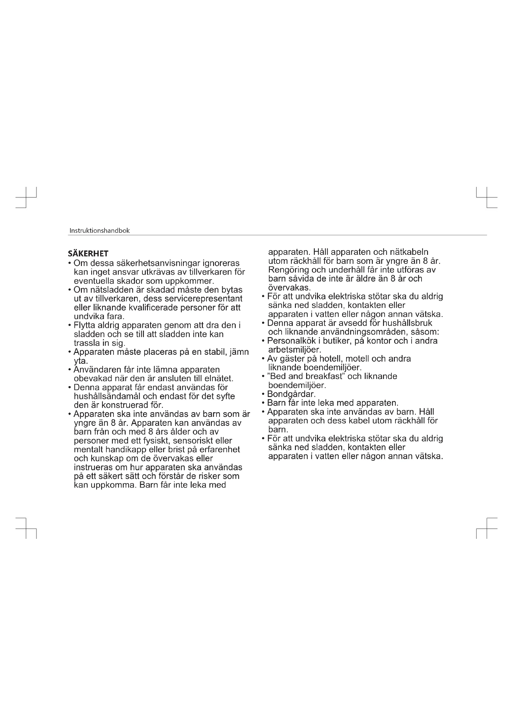 - För att undvika elektriska stötar ska du aldrig sänka ned sladden, kontakten eller apparaten i vatten eller någon annan vätska.Instruktionshandbok