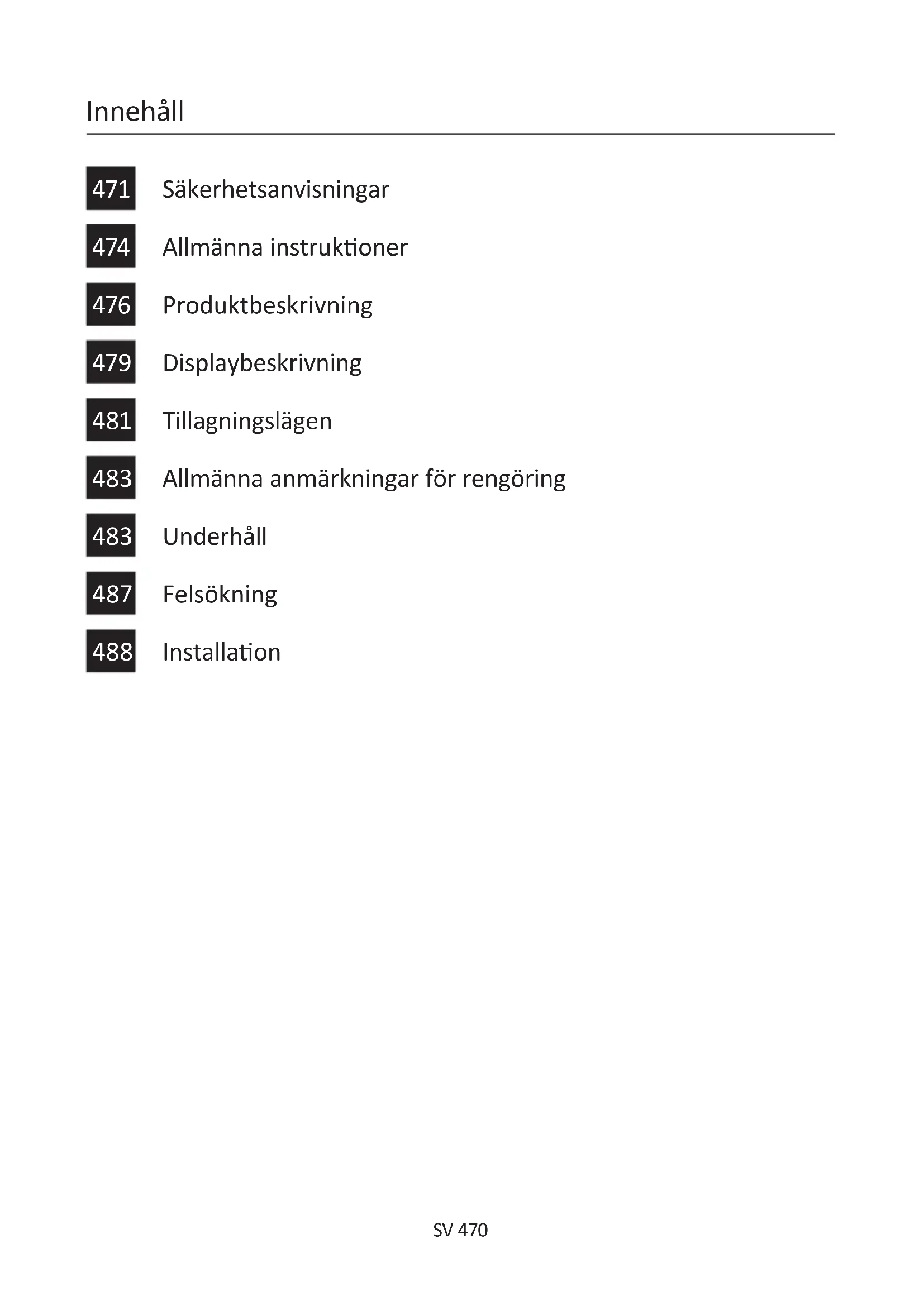 Varning: Se ll a apparaten är sval innan du rör vid den. Var försikg med alla heta ytor då det nns risk för brännskador. Använd desllerat eller drickbart vaen. 100 mlSV 487 Avfallshantering och miljöskydd Apparaten är märkt i enlighet med EU-direkv 2012/19/ EU gällande elektriska och elektron- iska apparater (WEEE). WEEE in- nehåller både miljöförstörande substanser och baselement (som kan återanvändas). Det är vikgt a WEEE genomgår specik bearbetning så a miljöförstörande ämnen avlägsnas och hanteras på rä sä, och andra material kan återvinnas. Individer kan spela en vikg roll i a säkerställa a WEEE inte blir e miljöproblem. Det är vikgt a följa några grundläggande re- gler: - WEEE ska inte betraktas som hushållsavfall. -WEEE ska tas ll en särskild återvinningsstaon som drivs kommunalt eller av e privat företag. I många länder kan stora WEEE-produkter häm- tas i hemmen. När du köper en ny apparat kan den gamla lämnas ll leverantören som måste acceptera den kostnadsfri som en engångslösning, så länge den gamla apparaten är av liknande typ och har samma funkoner som den nyinköpta apparaten.