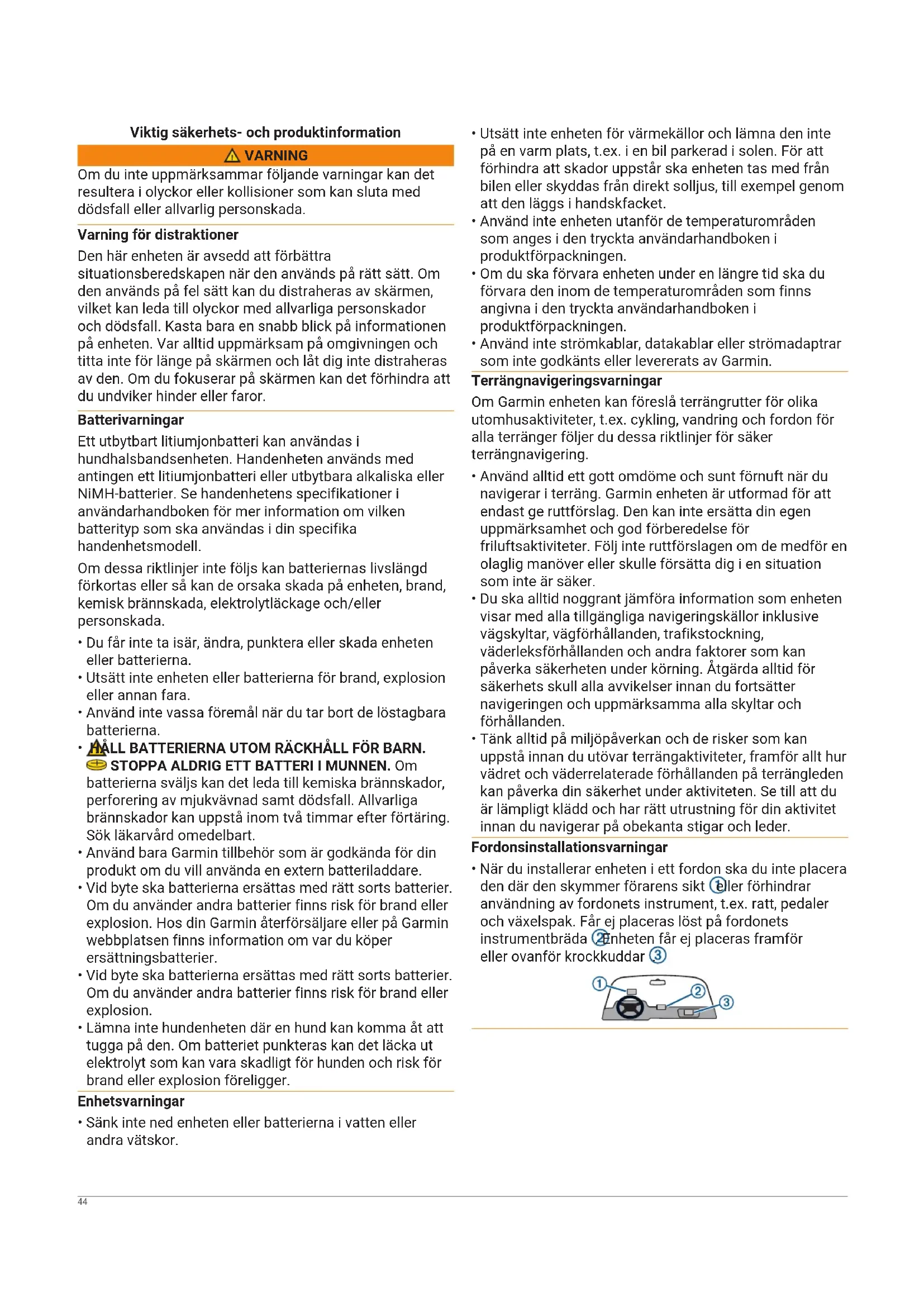 - Använd alltid ett gott omdöme och sunt förnuft när du navigerar i terräng. Garmin enheten är utformad för att endast ge ruttförslag. Den kan inte ersätta din egen uppmärksamhet och god förberedelse för friluftsaktiviteter. Följ inte ruttförslagen om de medför en olaglig manöver eller skulle försätta dig i en situation som inte är säker.