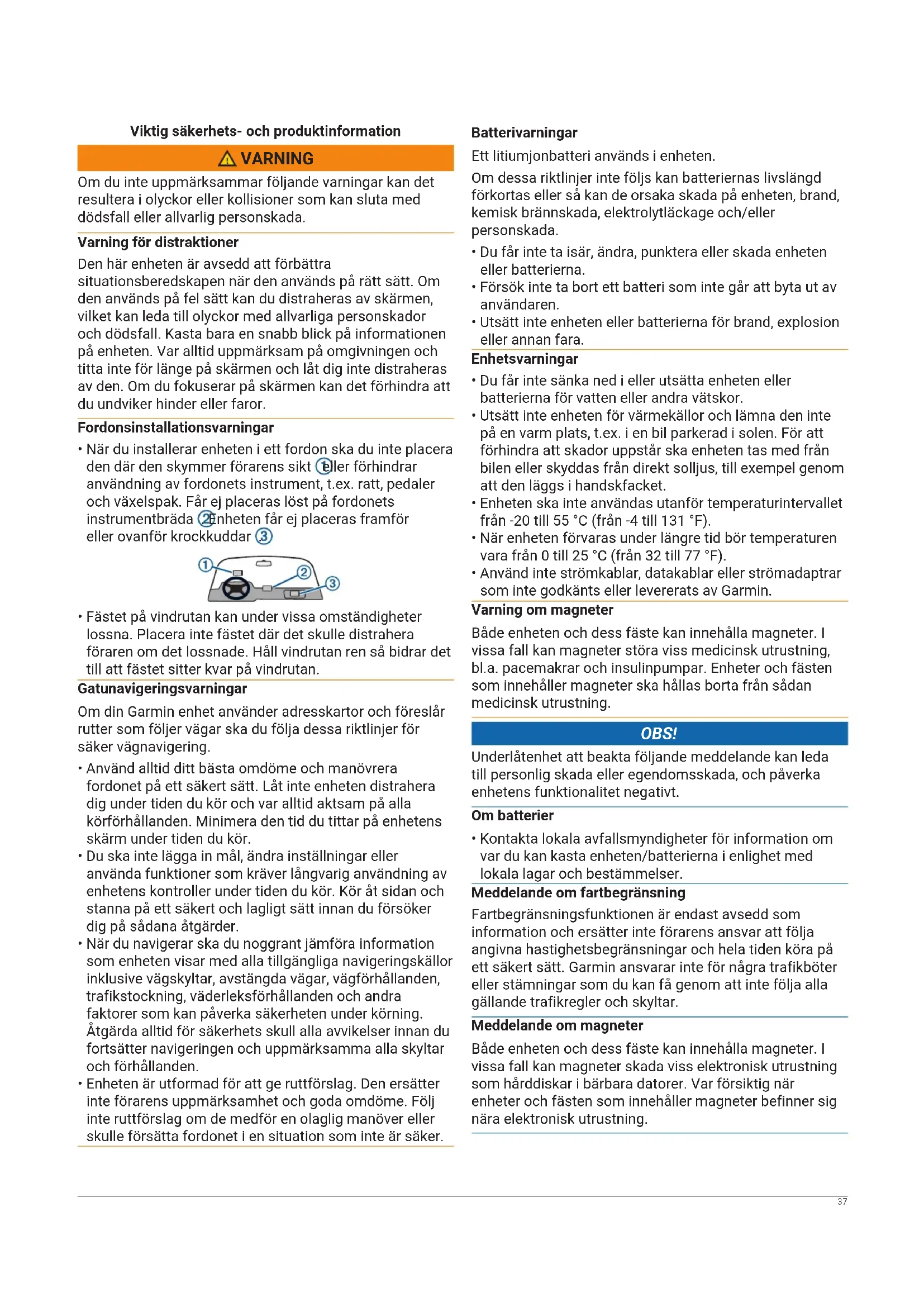 - Enheten är utformad för att ge ruttförslag. Den ersätter inte förarens uppmärksamhet och goda omdöme. Följ inte ruttförslag om de medför en olaglig manöver eller skulle försätta fordonet i en situation som inte är säker. Batterivarningar Ett litiumjonbatteri används i enheten. Om dessa riktlinjer inte följs kan batteriernas livslängd förkortas eller så kan de orsaka skada på enheten, brand, kemisk brännskada, elektrolytläckage och/eller personskada.