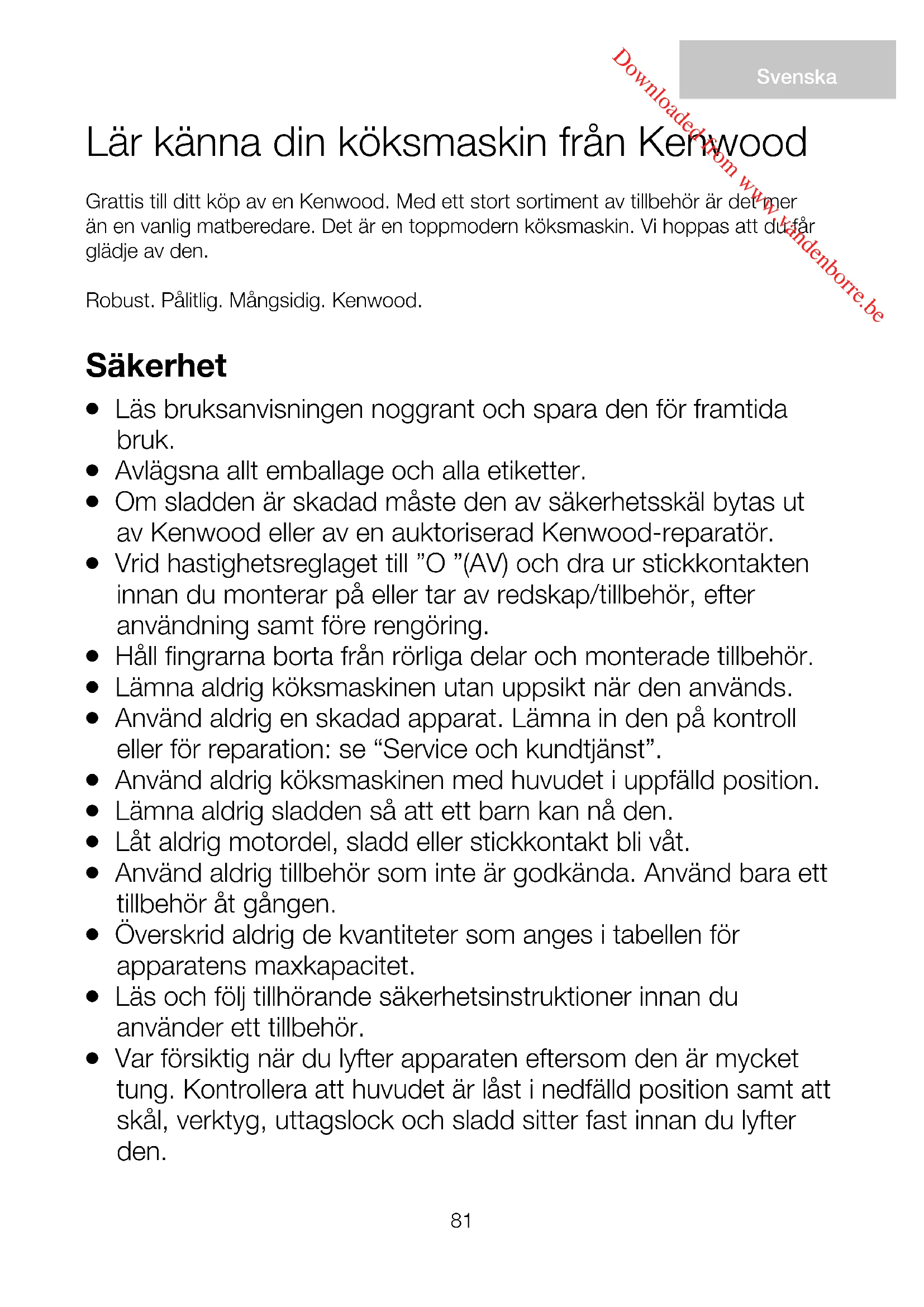Var försiktig när du lyfter apparaten eftersom den är mycket tung. Kontrollera att huvudet är låst i nedfälld position samt att skål, verktyg, uttagslock och sladd sitter fast innan du lyfter den. Downloaded from www.vandenborre.beSvenska