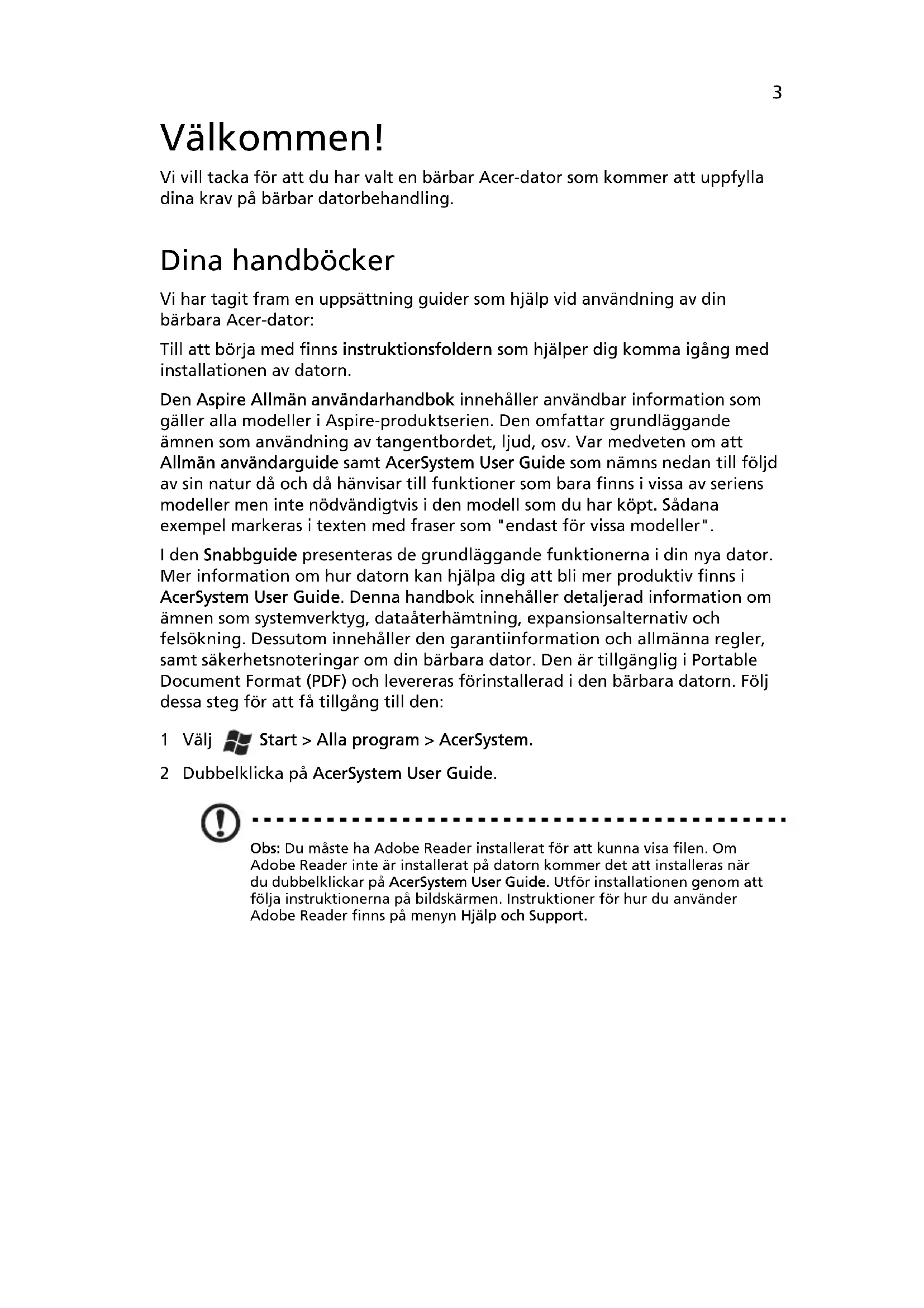 4Aspire bärbar-serien SnabbguideModellnummer: ___________________________________ Serienummer: _____________________________________ Inköpsdatum: _____________________________________ Inköpsställe: _______________________________________ © 2010 Med ensamrätt. Snabbguide för Aspire bärbar-serien Ursprunglig utgåva: 07/20103 Välkommen! Vi vill tacka för att du har valt en bärbar Acer-dator som kommer att uppfylla dina krav på bärbar datorbehandling. Dina handböcker Vi har tagit fram en uppsättning guider som hjälp vid användning av din bärbara Acer-dator: Till att börja med finns instruktionsfoldern som hjälper dig komma igång med installationen av datorn. Den Aspire Allmän användarhandbok innehåller användbar information som gäller alla modeller i Aspire-produktserien. Den omfattar grundläggande ämnen som användning av tangentbordet, ljud, osv. Var medveten om att Allmän användarguide samt AcerSystem User Guide som nämns nedan till följd av sin natur då och då hänvisar till funktioner som bara finns i vissa av seriens modeller men inte nödvändigtvis i den modell som du har köpt. Sådana exempel markeras i texten med fraser som "endast för vissa modeller". I den Snabbguide presenteras de grundläggande funktionerna i din nya dator. Mer information om hur datorn kan hjälpa dig att bli mer produktiv finns i AcerSystem User Guide. Denna handbok innehåller detaljerad information om ämnen som systemverktyg, dataåterhämtning, expansionsalternativ och felsökning. Dessutom innehåller den garantiinformation och allmänna regler, samt säkerhetsnoteringar om din bärbara dator. Den är tillgänglig i Portable Document Format (PDF) och levereras förinstallerad i den bärbara datorn. Följ dessa steg för att få tillgång till den: 1 Välj Start > Alla program > AcerSystem. 2 Dubbelklicka på AcerSystem User Guide. Obs: Du måste ha Adobe Reader installerat för att kunna visa filen. Om Adobe Reader inte är installerat på datorn kommer det att installeras när du dubbelklickar på AcerSystem User Guide. Utför installationen genom att följa instruktionerna på bildskärmen. Instruktioner för hur du använder Adobe Reader finns på menyn Hjälp och Support.4 Svenska Beskrivning av din bärbara Acer- dator När du har installerat datorn enligt illustrationen i instruktionsfoldern vill vi beskriva din nya bärbara Acer-dator. Vy över ovansidan