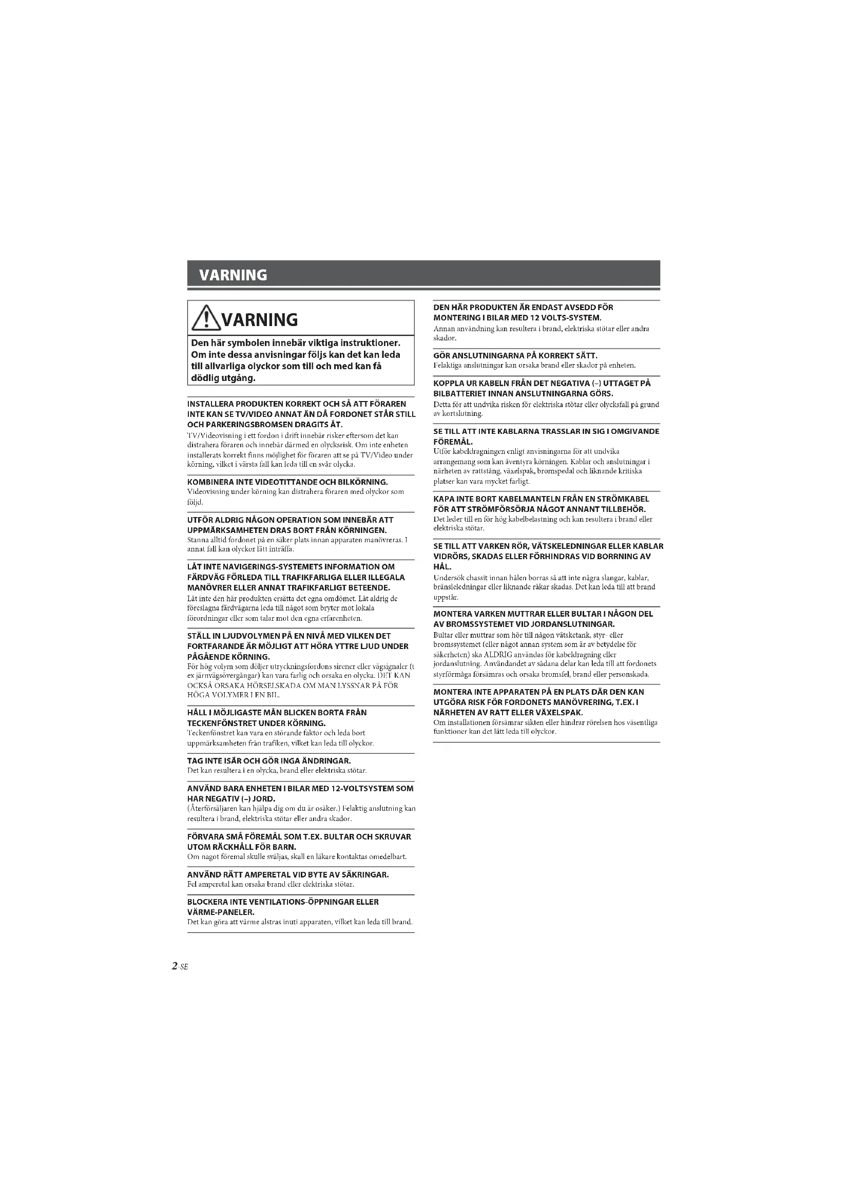 VÄRME-PANELER. Det kan göra att värme alstras inuti apparaten, vilket kan leda till brand. DEN HÄR PRODUKTEN ÄR ENDAST AVSEDD FÖR MONTERING I BILAR MED 12 VOLTS-SYSTEM. Annan användning kan resultera i brand, elektriska stötar eller andra skador. GÖR ANSLUTNINGARNA PÅ KORREKT SÄTT. Felaktiga anslutningar kan orsaka brand eller skador på enheten. KOPPLA UR KABELN FRÅN DET NEGATIVA (–) UTTAGET PÅ BILBATTERIET INNAN ANSLUTNINGARNA GÖRS. Detta för att undvika risken för elektriska stötar eller olycksfall på grund av kortslutning. SE TILL ATT INTE KABLARNA TRASSLAR IN SIG I OMGIVANDE FÖREMÅL. Utför kabeldragningen enligt anvisningarna för att undvika arrangemang som kan äventyra körningen. Kablar och anslutningar i närheten av rattstång, växelspak, bromspedal och liknande kritiska platser kan vara mycket farligt. KAPA INTE BORT KABELMANTELN FRÅN EN STRÖMKABEL FÖR ATT STRÖMFÖRSÖRJA NÅGOT ANNANT TILLBEHÖR. Det leder till en för hög kabelbelastning och kan resultera i brand eller elektriska stötar. SE TILL ATT VARKEN RÖR, VÄTSKELEDNINGAR ELLER KABLAR VIDRÖRS, SKADAS ELLER FÖRHINDRAS VID BORRNING AV HÅL. Undersök chassit innan hålen borras så att inte några slangar, kablar, bränsleledningar eller liknande råkar skadas. Det kan leda till att brand uppstår. MONTERA VARKEN MUTTRAR ELLER BULTAR I NÅGON DEL AV BROMSSYSTEMET VID JORDANSLUTNINGAR. Bultar eller muttrar som hör till någon vätsketank, styr- eller bromssystemet (eller något annan system som är av betydelse för säkerheten) ska ALDRIG användas för kabeldragning eller jordanslutning. Användandet av sådana delar kan leda till att fordonets styrförmåga försämras och orsaka bromsfel, brand eller personskada. MONTERA INTE APPARATEN PÅ EN PLATS DÄR DEN KAN UTGÖRA RISK FÖR FORDONETS MANÖVRERING, T.EX. I NÄRHETEN AV RATT ELLER VÄXELSPAK. Om installationen försämrar sikten eller hindrar rörelsen hos väsentliga funktioner kan det lätt leda till olyckor.3-SE FÖRSIKTIGT Den här symbolen innebär viktiga instruktioner. Underlåtenhet att följa dem kan leda till skador på person eller egendom. AVBRYT GENAST ANVÄNDNING OM PROBLEM UPPSTÅR. I annat fall kan personskador eller skador på själva enheten uppstå. Lämna apparaten till återförsäljaren för reparation. LÅT EN FACKKUNNIG TEKNIKER GÖRA KABELDRAGNINGEN OCH MONTERINGEN. Kabeldragningen och monteringen av denna apparat kräver teknisk kunskap och erfarenhet. Kontakta återförsäljaren, som sålde apparaten, för utförandet av säker montering. ANVÄND ALLTID SPECIFICERADE TILLBEHÖR OCH MONTERA TILLBEHÖREN ORDENTLIGT. Användandet av andra delar än som är avsedda för denna apparat kan leda till att apparaten skadas invändigt eller till ostadig montering på grund av lossnande delar. DRA KABLARNA RAKA OCH SÅ ATT DE INTE KOMMER I KLÄM ELLER SKAVER MOT SKARPA KANTER. Undvik kläm- och nötskador genom att se till att kablarna går fria från rörliga delar (t.ex. bilsätenas glidbanor) och skarpa och spetsiga kanter. Om kablarna måste dras genom hål i plåten bör gummibussningar användas som skydd, så att inte kablarna ligger och nöter mot metallen. MONTERA INTE APPARATEN DÄR DEN UTSÄTTS FÖR FUKT ELLER DAMM. Undvik att installera enheten på platser där fukt och damm kan tränga in och ställa till skador.