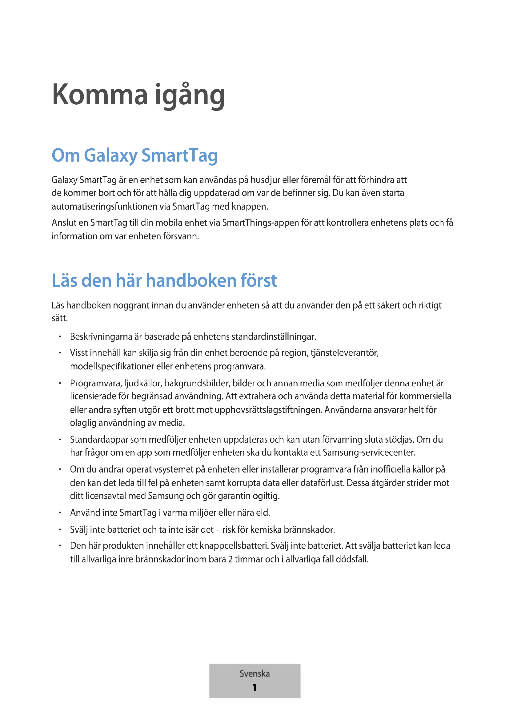 Komma igång Om Galaxy SmartTag Galaxy SmartTag är en enhet som kan användas på husdjur eller föremål för att förhindra att de kommer bort och för att hålla dig uppdaterad om var de befinner sig. Du kan även starta automatiseringsfunktionen via SmartTag med knappen. Anslut en SmartTag till din mobila enhet via SmartThings-appen för att kontrollera enhetens plats och få information om var enheten försvann. Läs den här handboken först Läs handboken noggrant innan du använder enheten så att du använder den på ett säkert och riktigt sätt.