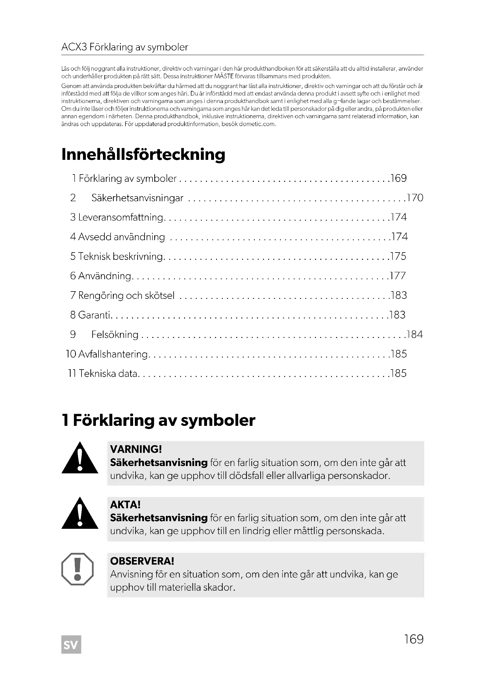 - Läs och följ noggrant alla instruktioner, direktiv och varningar i den här produkthandboken för att säkerställa att du alltid installerar, använder och underhåller produkten på rätt sätt. Dessa instruktioner MÅSTE förvaras tillsammans med produkten. Genom att använda produkten bekräftar du härmed att du noggrant har läst alla instruktioner, direktiv och varningar och att du förstår och är införstådd med att följa de villkor som anges häri. Du är införstådd med att endast använda denna produkt i avsett syfte och i enlighet med instruktionerna, direktiven och varningarna som anges i denna produkthandbok samt i enlighet med alla g¬lande lagar och bestämmelser. Om du inte läser och följer instruktionerna och varningarna som anges här kan det leda till personskador på dig eller andra, på produkten eller annan egendom i närheten. Denna produkthandbok, inklusive instruktionerna, direktiven och varningarna samt relaterad information, kan ändras och uppdateras. För uppdaterad produktinformation, besök dometic.com. Innehållsförteckning 1 Förklaring av symboler p. 169