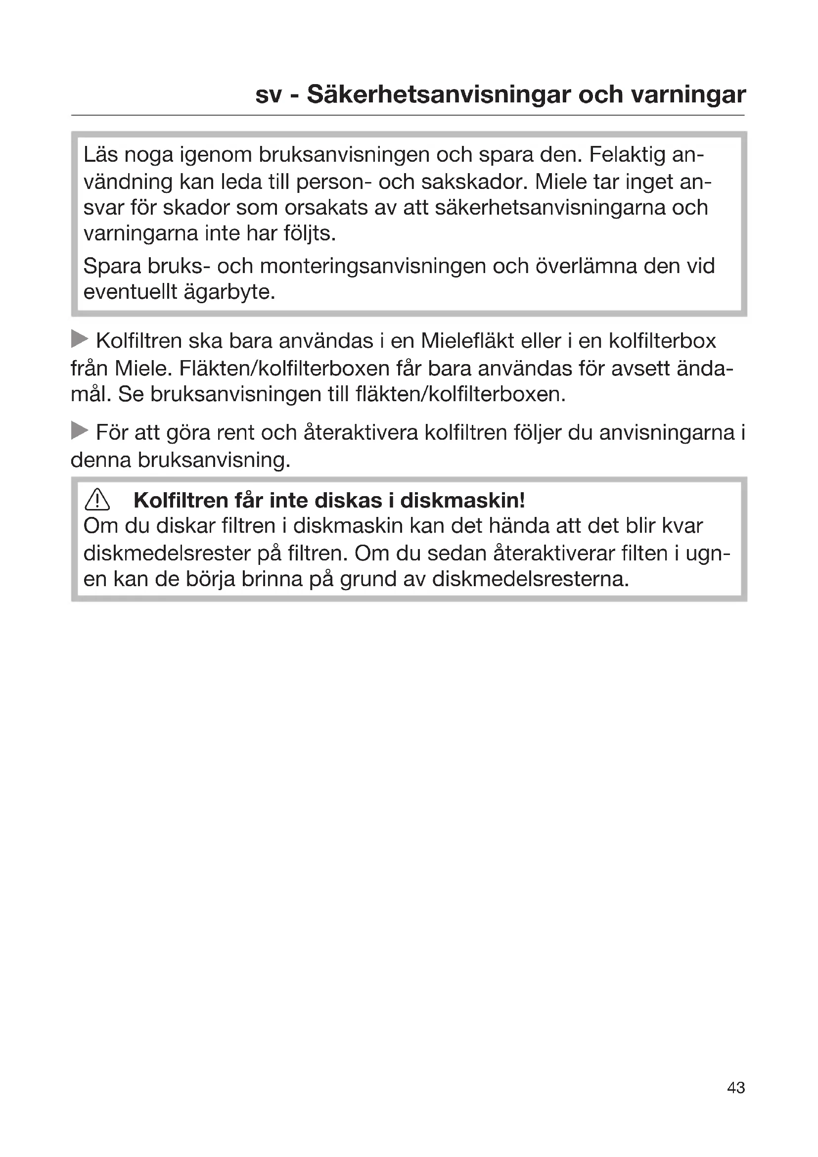 Läs noga igenom bruksanvisningen och spara den. Felaktig an- vändning kan leda till person- och sakskador. Miele tar inget an- svar för skador som orsakats av att säkerhetsanvisningarna och varningarna inte har följts. Spara bruks- och monteringsanvisningen och överlämna den vid eventuellt ägarbyte. Kolfiltren ska bara användas i en Mielefläkt eller i en kolfilterbox från Miele. Fläkten/kolfilterboxen får bara användas för avsett ända- mål. Se bruksanvisningen till fläkten/kolfilterboxen. För att göra rent och återaktivera kolfiltren följer du anvisningarna i denna bruksanvisning. Kolfiltren får inte diskas i diskmaskin! Om du diskar filtren i diskmaskin kan det hända att det blir kvar diskmedelsrester på filtren. Om du sedan återaktiverar filten i ugn- en kan de börja brinna på grund av diskmedelsresterna.sv - Bruksanvisning