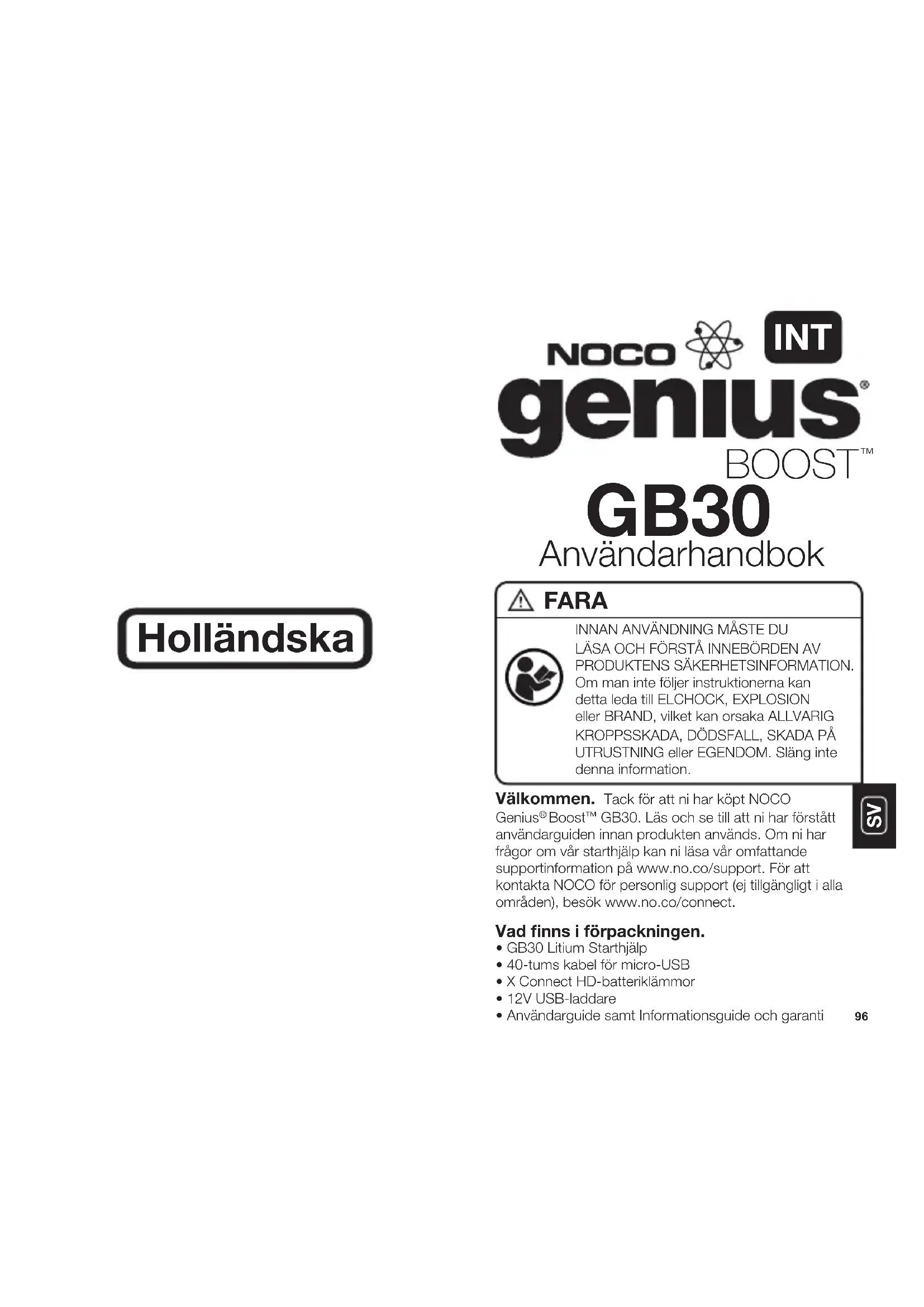 Välkommen. Tack för att ni har köpt NOCO Genius Boost GB30. Läs och se till att ni har förstått användarguiden innan produkten används. Om ni har frågor om vår starthjälp kan ni läsa vår omfattande supportinformation på www.no.co/support. För att kontakta NOCO för personlig support (ej tillgängligt i alla områden), besök www.no.co/connect.Vad finns i förpackningen.• GB30 Litium Starthjälp• 40-tums kabel för micro-USB• X Connect HD-batteriklämmor• 12V USB-laddare• Användarguide samt Informationsguide och garantiINNAN ANVÄNDNING MÅSTE DU LÄSA OCH FÖRSTÅ INNEBÖRDEN AV PRODUKTENS SÄKERHETSINFORMATION. Om man inte följer instruktionerna kan detta leda till ELCHOCK, EXPLOSION eller BRAND, vilket kan orsaka ALLVARIG KROPPSSKADA, DÖDSFALL, SKADA PÅ UTRUSTNING eller EGENDOM. Släng inte denna information. FARA Användarhandbok GB30 BOOST
