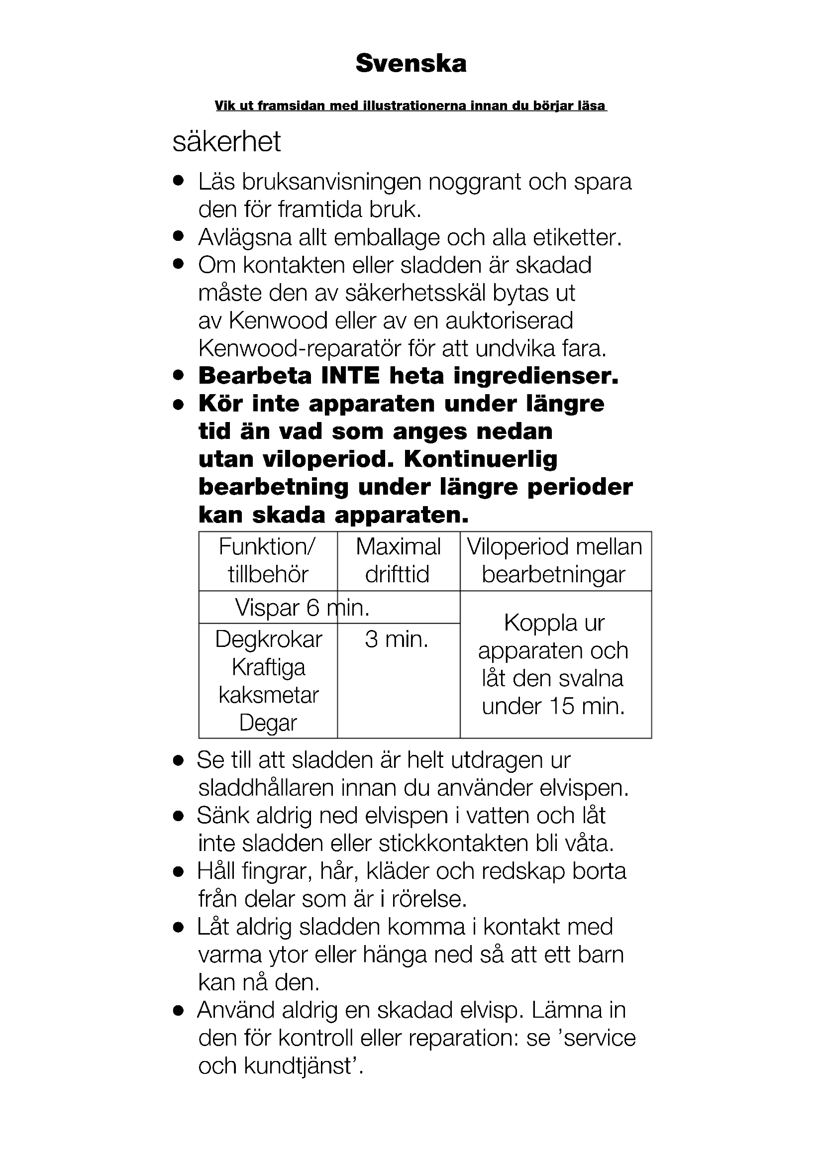 Kör inte apparaten under längre tid än vad som anges nedan utan viloperiod. Kontinuerlig bearbetning under längre perioder kan skada apparaten. Funktion/ tillbehör Maximal drifttid Viloperiod mellan bearbetningar Vispar 6 min. Koppla ur apparaten och låt den svalna under 15 min. Degkrokar Kraftiga kaksmetar Degar 3 min.