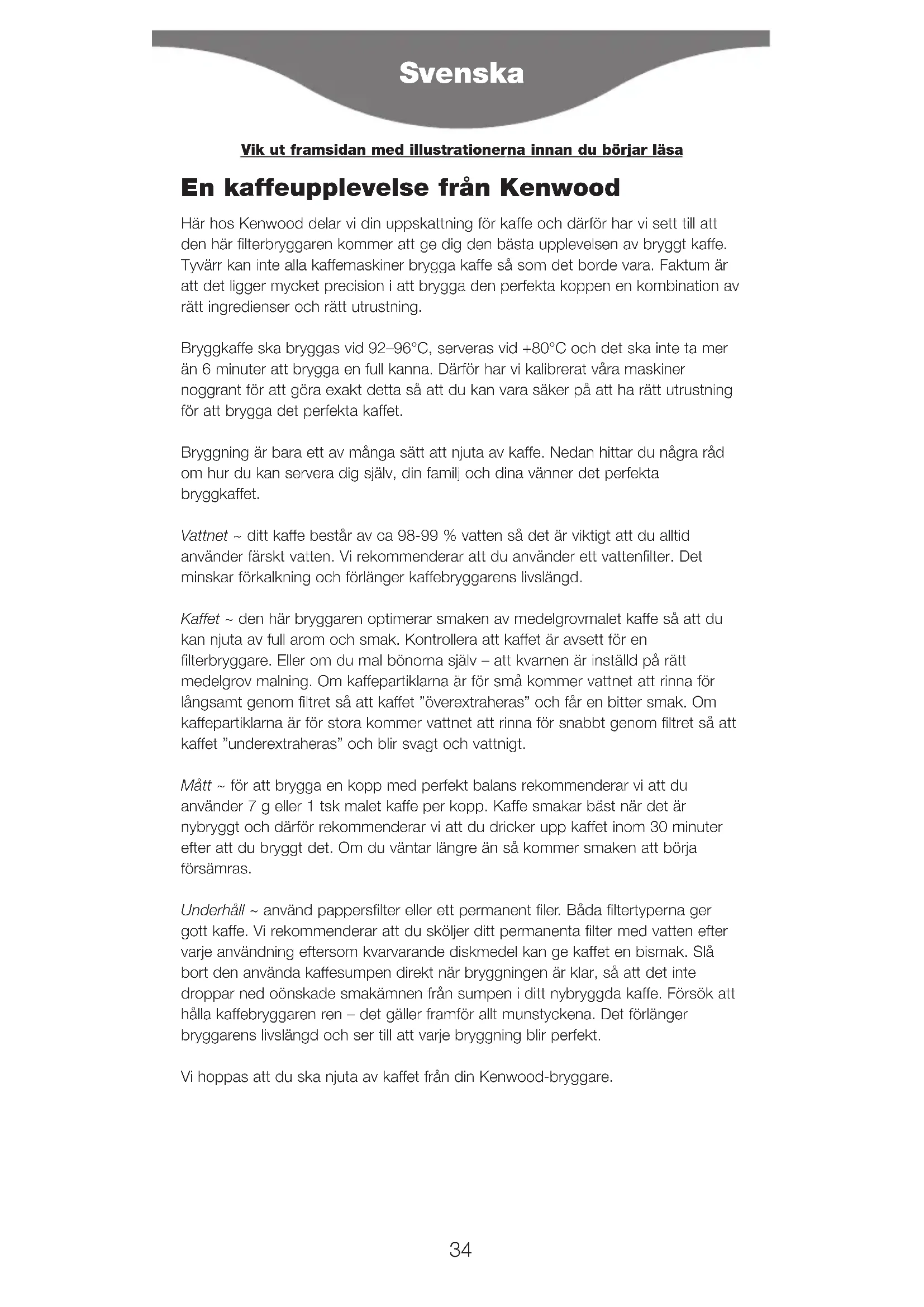 DIREKTIV 2002/96/CE. Ved afslutningen af dets produktive liv må produktet ikke bortskaffes som almindeligt affald. Det bør afleveres på et specialiseret lokalt genbrugscenter eller til en forhandler, der yder denne service. At bortskaffe et elektrisk husholdningsapparat separat gør det muligt at undgå eventuelle negative konsekvenser for miljø og helbred på grund af upassende bortskaffelse, og det giver mulighed for at genbruge de materialer det består af, og dermed opnå en betydelig energi- og ressourcebesparelse. Som en påmindelse om nødvendigheden af at bortskaffe elektriske husholdningsapparater separat, er produktet mærket med en mobil affaldsbeholder med et kryds. 33En kaffeupplevelse från Kenwood Här hos Kenwood delar vi din uppskattning för kaffe och därför har vi sett till att den här filterbryggaren kommer att ge dig den bästa upplevelsen av bryggt kaffe. Tyvärr kan inte alla kaffemaskiner brygga kaffe så som det borde vara. Faktum är att det ligger mycket precision i att brygga den perfekta koppen en kombination av rätt ingredienser och rätt utrustning. Bryggkaffe ska bryggas vid 92–96°C, serveras vid +80°C och det ska inte ta mer än 6 minuter att brygga en full kanna. Därför har vi kalibrerat våra maskiner noggrant för att göra exakt detta så att du kan vara säker på att ha rätt utrustning för att brygga det perfekta kaffet. Bryggning är bara ett av många sätt att njuta av kaffe. Nedan hittar du några råd om hur du kan servera dig själv, din familj och dina vänner det perfekta bryggkaffet. Vattnet ~ ditt kaffe består av ca 98-99 % vatten så det är viktigt att du alltid använder färskt vatten. Vi rekommenderar att du använder ett vattenfilter. Det minskar förkalkning och förlänger kaffebryggarens livslängd. Kaffet ~ den här bryggaren optimerar smaken av medelgrovmalet kaffe så att du kan njuta av full arom och smak. Kontrollera att kaffet är avsett för en filterbryggare. Eller om du mal bönorna själv – att kvarnen är inställd på rätt medelgrov malning. Om kaffepartiklarna är för små kommer vattnet att rinna för långsamt genom filtret så att kaffet ”överextraheras” och får en bitter smak. Om kaffepartiklarna är för stora kommer vattnet att rinna för snabbt genom filtret så att kaffet ”underextraheras” och blir svagt och vattnigt. Mått ~ för att brygga en kopp med perfekt balans rekommenderar vi att du använder 7 g eller 1 tsk malet kaffe per kopp. Kaffe smakar bäst när det är nybryggt och därför rekommenderar vi att du dricker upp kaffet inom 30 minuter efter att du bryggt det. Om du väntar längre än så kommer smaken att börja försämras. Underhåll ~ använd pappersfilter eller ett permanent filer. Båda filtertyperna ger gott kaffe. Vi rekommenderar att du sköljer ditt permanenta filter med vatten efter varje användning eftersom kvarvarande diskmedel kan ge kaffet en bismak. Slå bort den använda kaffesumpen direkt när bryggningen är klar, så att det inte droppar ned oönskade smakämnen från sumpen i ditt nybryggda kaffe. Försök att hålla kaffebryggaren ren – det gäller framför allt munstyckena. Det förlänger bryggarens livslängd och ser till att varje bryggning blir perfekt. Vi hoppas att du ska njuta av kaffet från din Kenwood-bryggare. Svenska