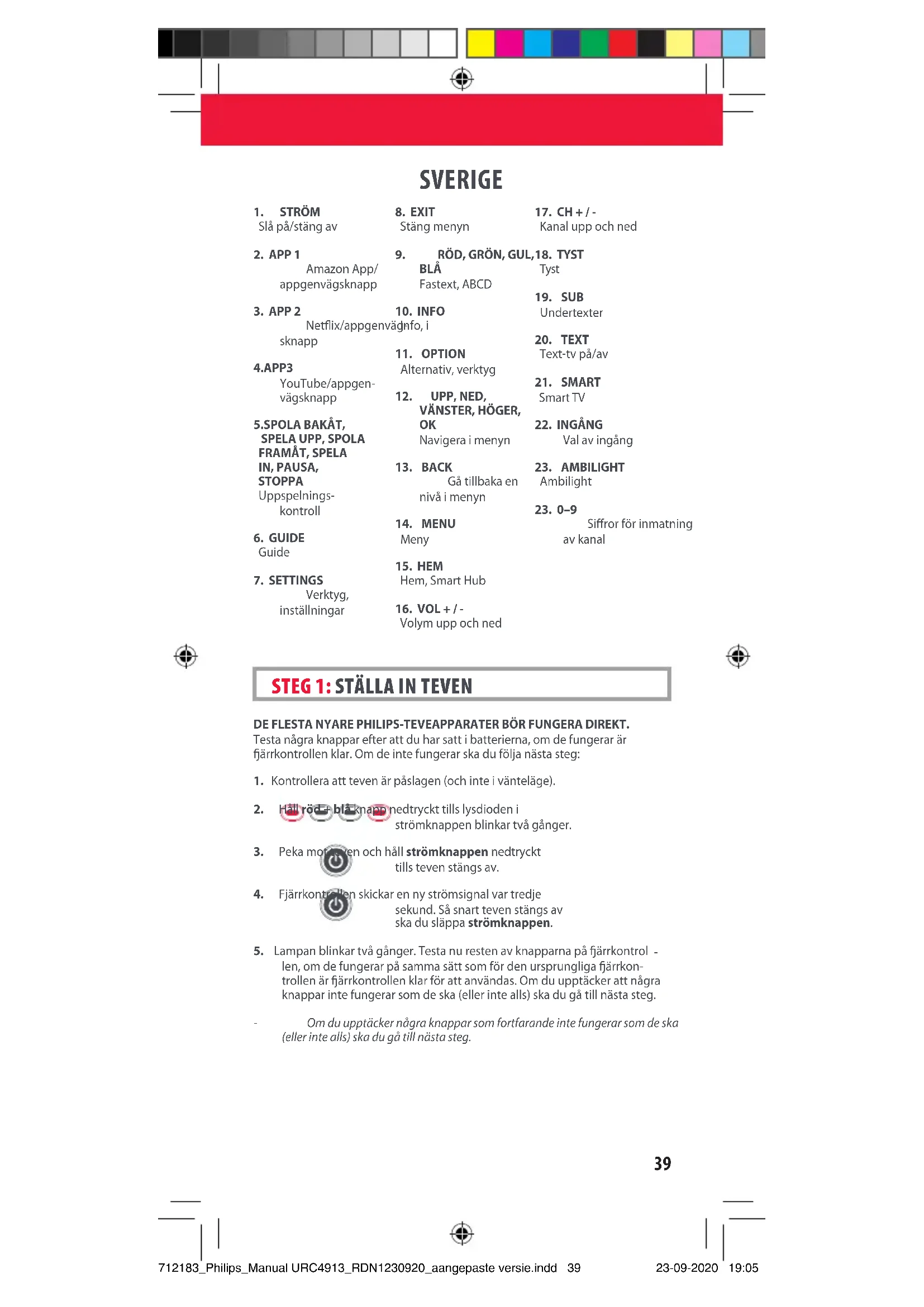 NORSK 712183_Philips_Manual URC4913_RDN1230920_aangepaste versie.indd 38712183_Philips_Manual URC4913_RDN1230920_aangepaste versie.indd 38 23-09-2020 19:0523-09-2020 19:0539 SVERIGE DE FLESTA NYARE PHILIPS-TEVEAPPARATER BÖR FUNGERA DIREKT. Testa några knappar efter att du har satt i batterierna, om de fungerar är ärrkontrollen klar. Om de inte fungerar ska du följa nästa steg: