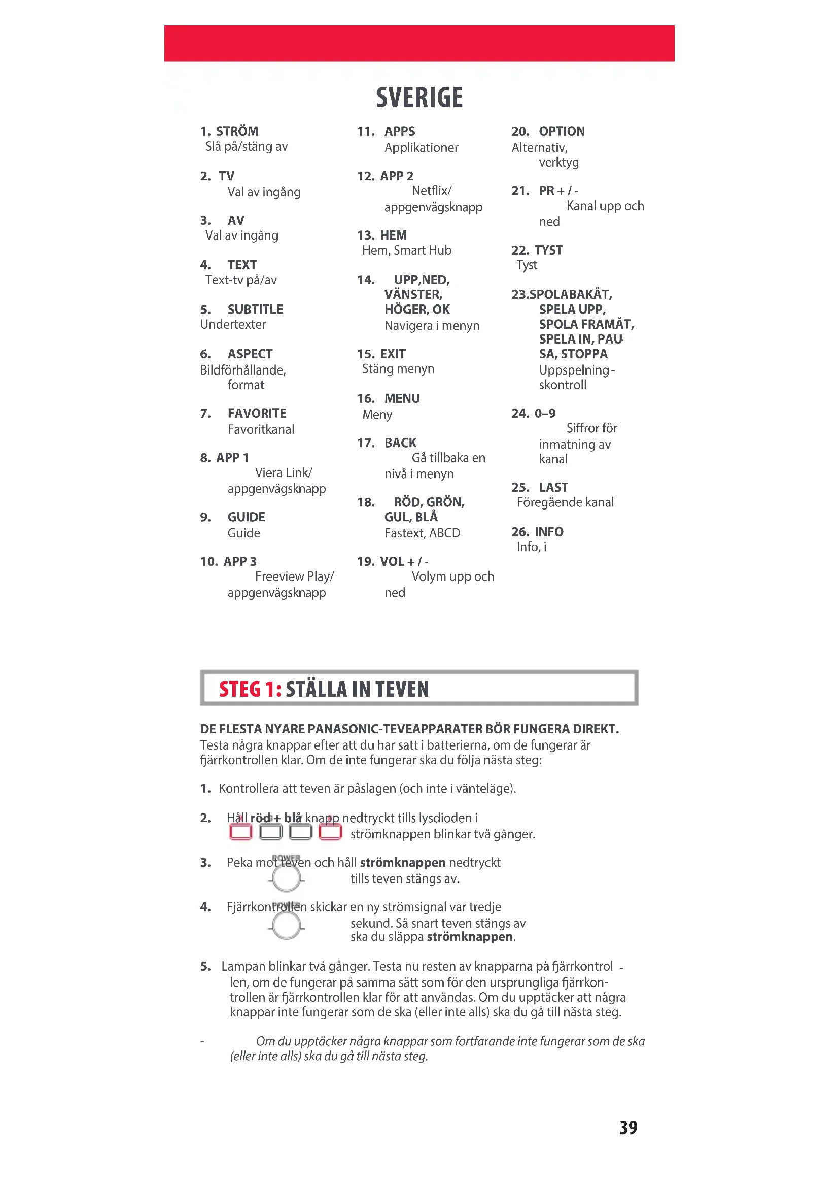NORSK 712188_Panasonic_manual URC4914_RDN1091120.indd 38712188_Panasonic_manual URC4914_RDN1091120.indd 38 09-11-2020 13:1509-11-2020 13:1539 SVERIGE DE FLESTA NYARE PANASONIC-TEVEAPPARATER BÖR FUNGERA DIREKT. Testa några knappar efter att du har satt i batterierna, om de fungerar är ärrkontrollen klar. Om de inte fungerar ska du följa nästa steg: