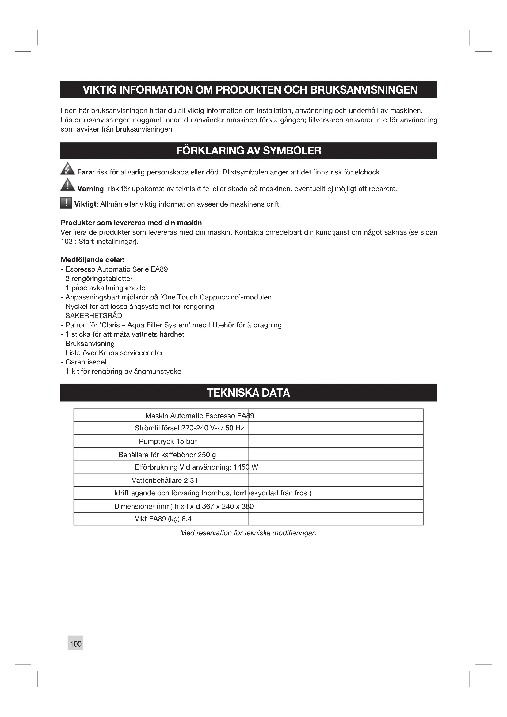 Viktigt: Allmän eller viktig information avseende maskinens drift. Produkter som levereras med din maskin Veriera de produkter som levereras med din maskin. Kontakta omedelbart din kundtjänst om något saknas (se sidan 103 : Start-inställningar). Medföljande delar: - Espresso Automatic Serie EA89 - 2 rengöringstabletter - 1 påse avkalkningsmedel - Anpassningsbart mjölkrör på ‘One Touch Cappuccino’-modulen - Nyckel för att lossa ångsystemet för rengöring