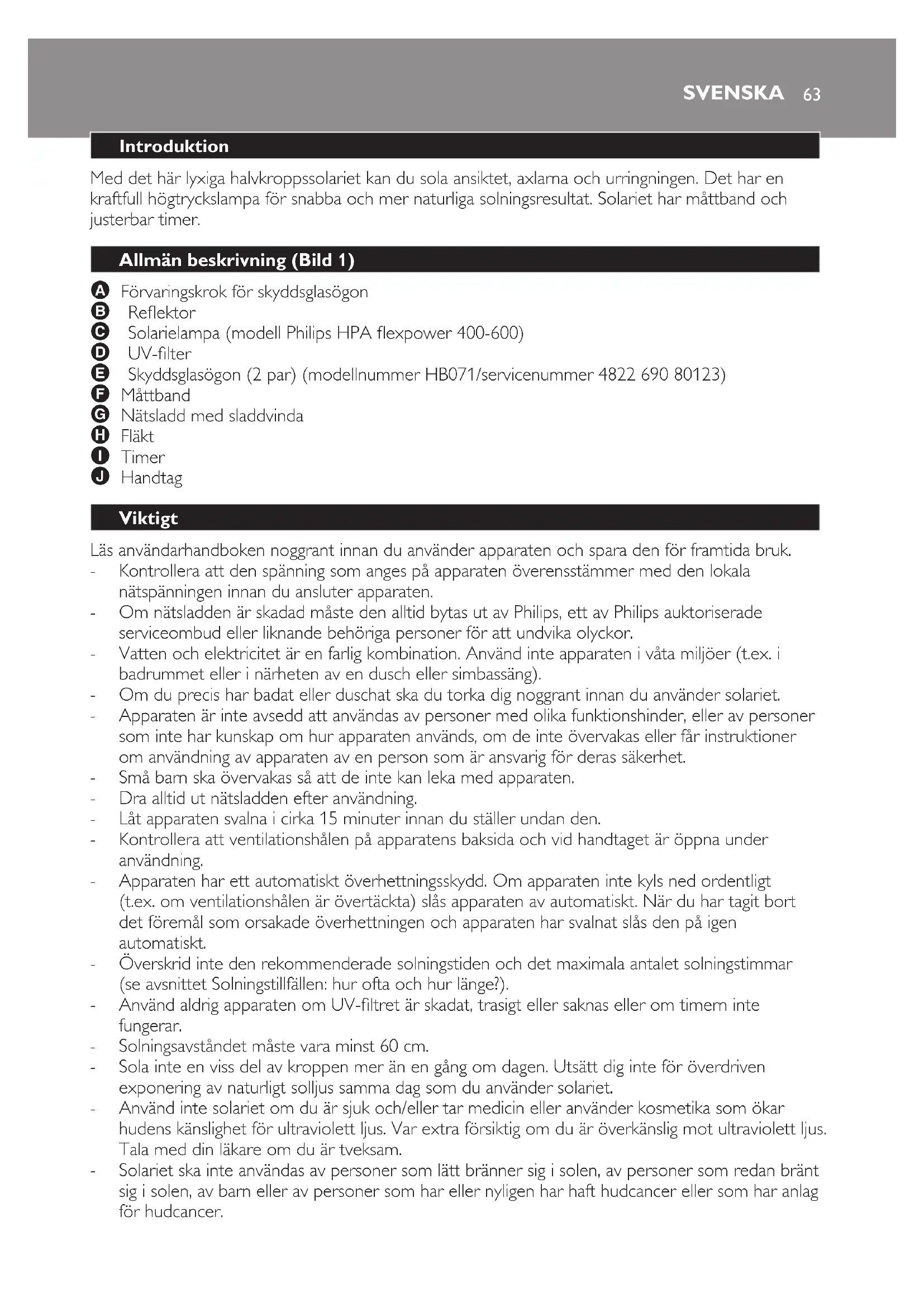 PORTUGUÊS 6162 Resolução de problemas Seocorreremproblemascomesteaparelhoenãoforcapazdeosresolveratravésdasindicações dadas a seguir, contacte o centro de assistência Philips mais próximo ou o Centro de Atendimento aoClientePhilipsdoseupaís. Problema Solução O aparelho não arranca. Certique-sedequeachafoibemintroduzidanatomadaeléctrica. Podehaverfalhadeenergia.Veriquesehácorrenteligandooutro aparelho. Otemporizadorpodenãotersidodenido.Reguleotemporizador paraotempodebronzeamentoadequado. A lâmpada pode estar ainda demasiado quente para reiniciar. Deixe que alâmpadaarrefeçadurante3minutosantesdeligarnovamenteo aparelho. Os resultados não satisfazem. Provavelmenteestáautilizarumaextensãodemasiadocompridaouque não tem a voltagem correcta. Consulte o seu revendedor. Não recomendamosautilizaçãodeumaextensão. Podeterrealizadoumperíododebronzeamentonãoadequadoparao seutipodepele.Consulteatabelanasecção‘Sessõesdebronzeamento: frequênciaeduração?’ Talvezadistânciaentrealâmpadaeoseucorposejasuperiorà recomendada. Aomdealgumtempodeutilizaçãodalâmpada,acapacidadede bronzeamentodiminui.Esteefeitosósetornaperceptívelpassados algunsanos.Pararesolveresteproblema,aumenteotempodassessões ou substitua a lâmpada. PORTUGUÊS6263 Introduktion Med det här lyxiga halvkroppssolariet kan du sola ansiktet, axlarna och urringningen. Det har en kraftfull högtryckslampa för snabba och mer naturliga solningsresultat. Solariet har måttband och justerbar timer. Allmän beskrivning (Bild 1) A Förvaringskrok för skyddsglasögon B Reektor C Solarielampa(modellPhilipsHPAexpower400-600) D UV-lter E Skyddsglasögon(2par)(modellnummerHB071/servicenummer482269080123) F Måttband G Nätsladd med sladdvinda H Fläkt I Timer J Handtag Viktigt Läs användarhandboken noggrant innan du använder apparaten och spara den för framtida bruk. Kontrollera att den spänning som anges på apparaten överensstämmer med den lokala nätspänningen innan du ansluter apparaten. Om nätsladden är skadad måste den alltid bytas ut av Philips, ett av Philips auktoriserade serviceombud eller liknande behöriga personer för att undvika olyckor. Vatten och elektricitet är en farlig kombination. Använd inte apparaten i våta miljöer (t.ex. i badrummetellerinärhetenavenduschellersimbassäng). Om du precis har badat eller duschat ska du torka dig noggrant innan du använder solariet. Apparaten är inte avsedd att användas av personer med olika funktionshinder, eller av personer som inte har kunskap om hur apparaten används, om de inte övervakas eller får instruktioner om användning av apparaten av en person som är ansvarig för deras säkerhet. Små barn ska övervakas så att de inte kan leka med apparaten. Dra alltid ut nätsladden efter användning. Låtapparatensvalnaicirka15minuterinnanduställerundanden. Kontrollera att ventilationshålen på apparatens baksida och vid handtaget är öppna under användning. Apparaten har ett automatiskt överhettningsskydd. Om apparaten inte kyls ned ordentligt (t.ex.omventilationshålenärövertäckta)slåsapparatenavautomatiskt.Närduhartagitbort det föremål som orsakade överhettningen och apparaten har svalnat slås den på igen automatiskt. Överskrid inte den rekommenderade solningstiden och det maximala antalet solningstimmar (seavsnittetSolningstillfällen:huroftaochhurlänge?). AnvändaldrigapparatenomUV-ltretärskadat,trasigtellersaknaselleromtimerninte fungerar. Solningsavståndetmåstevaraminst60cm. Sola inte en viss del av kroppen mer än en gång om dagen. Utsätt dig inte för överdriven exponering av naturligt solljus samma dag som du använder solariet. Användintesolarietomduärsjukoch/ellertarmedicinelleranvänderkosmetikasomökar hudens känslighet för ultraviolett ljus. Var extra försiktig om du är överkänslig mot ultraviolett ljus. Tala med din läkare om du är tveksam. Solariet ska inte användas av personer som lätt bränner sig i solen, av personer som redan bränt sig i solen, av barn eller av personer som har eller nyligen har haft hudcancer eller som har anlag för hudcancer.