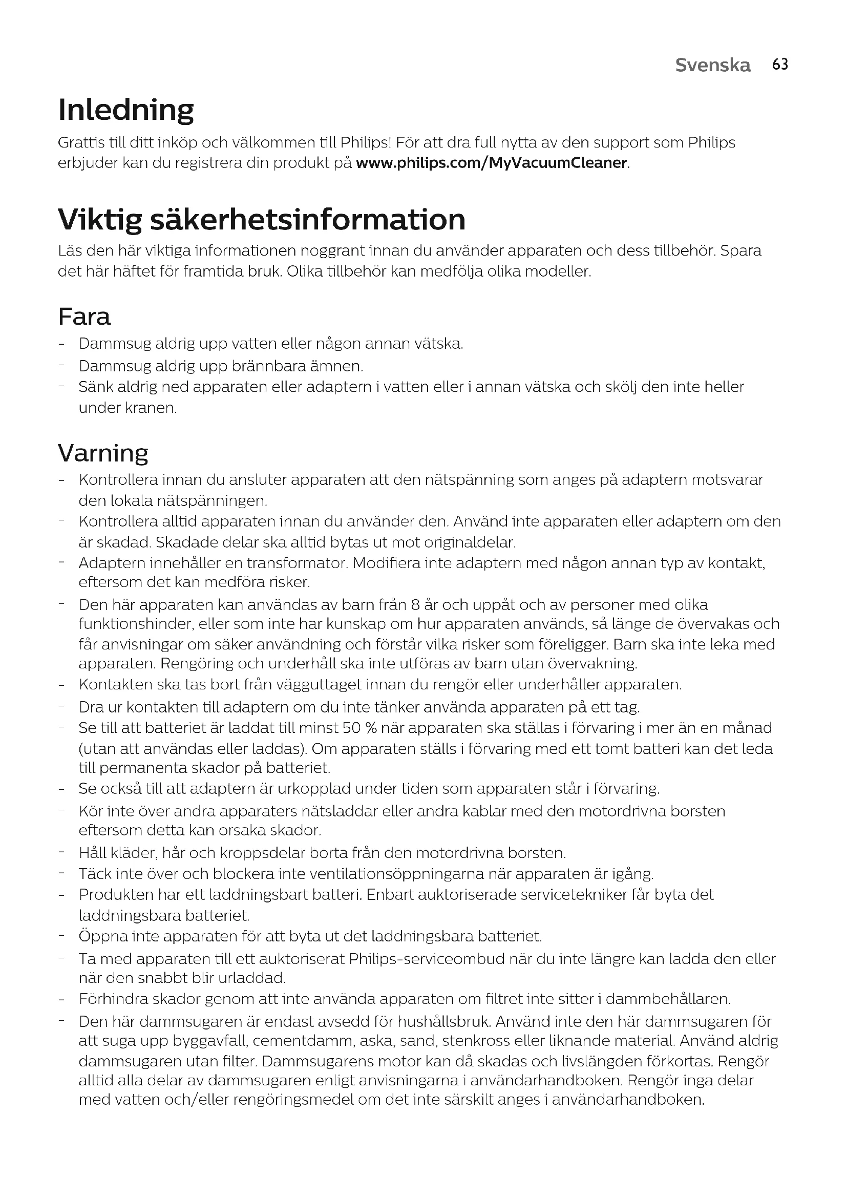Svenska Inledning Grattis till ditt inköp och välkommen till Philips! För att dra full nytta av den support som Philips erbjuder kan du registrera din produkt på www.philips.com/MyVacuumCleaner. Viktig säkerhetsinformation Läs den här viktiga informationen noggrant innan du använder apparaten och dess tillbehör. Spara det här häftet för framtida bruk. Olika tillbehör kan medfölja olika modeller. Fara