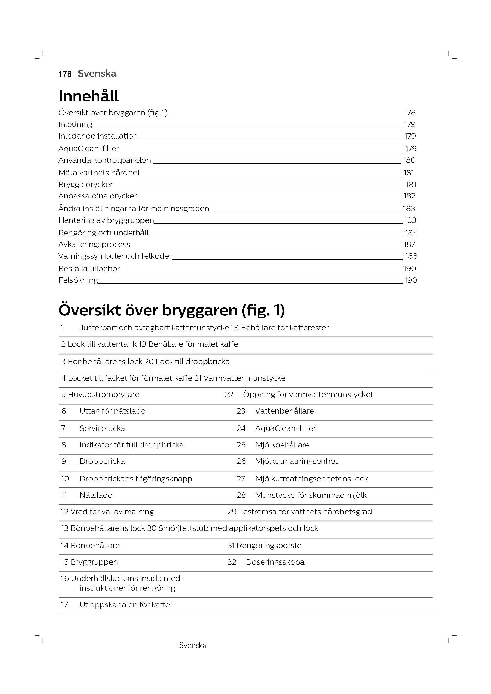 Justerbart och avtagbart kaffemunstycke 18 Behållare för kafferester 2 Lock till vattentank 19 Behållare för malet kaffe 3 Bönbehållarens lock 20 Lock till droppbricka 4 Locket till facket för förmalet kaffe 21 Varmvattenmunstycke 5 Huvudströmbrytare 22 Öppning för varmvattenmunstycket 6 Uttag för nätsladd 23 Vattenbehållare 7 Servicelucka 24 AquaClean-filter 8 Indikator för full droppbricka 25 Mjölkbehållare 9 Droppbricka 26 Mjölkutmatningsenhet 10 Droppbrickans frigöringsknapp 27 Mjölkutmatningsenhetens lock 11 Nätsladd 28 Munstycke för skummad mjölk 12 Vred för val av malning 29 Testremsa för vattnets hårdhetsgrad 13 Bönbehållarens lock 30 Smörjfettstub med applikatorspets och lock 14 Bönbehållare 31 Rengöringsborste 15 Bryggruppen 32 Doseringsskopa 16 Underhållsluckans insida med instruktioner för rengöring 17 Utloppskanalen för kaffe