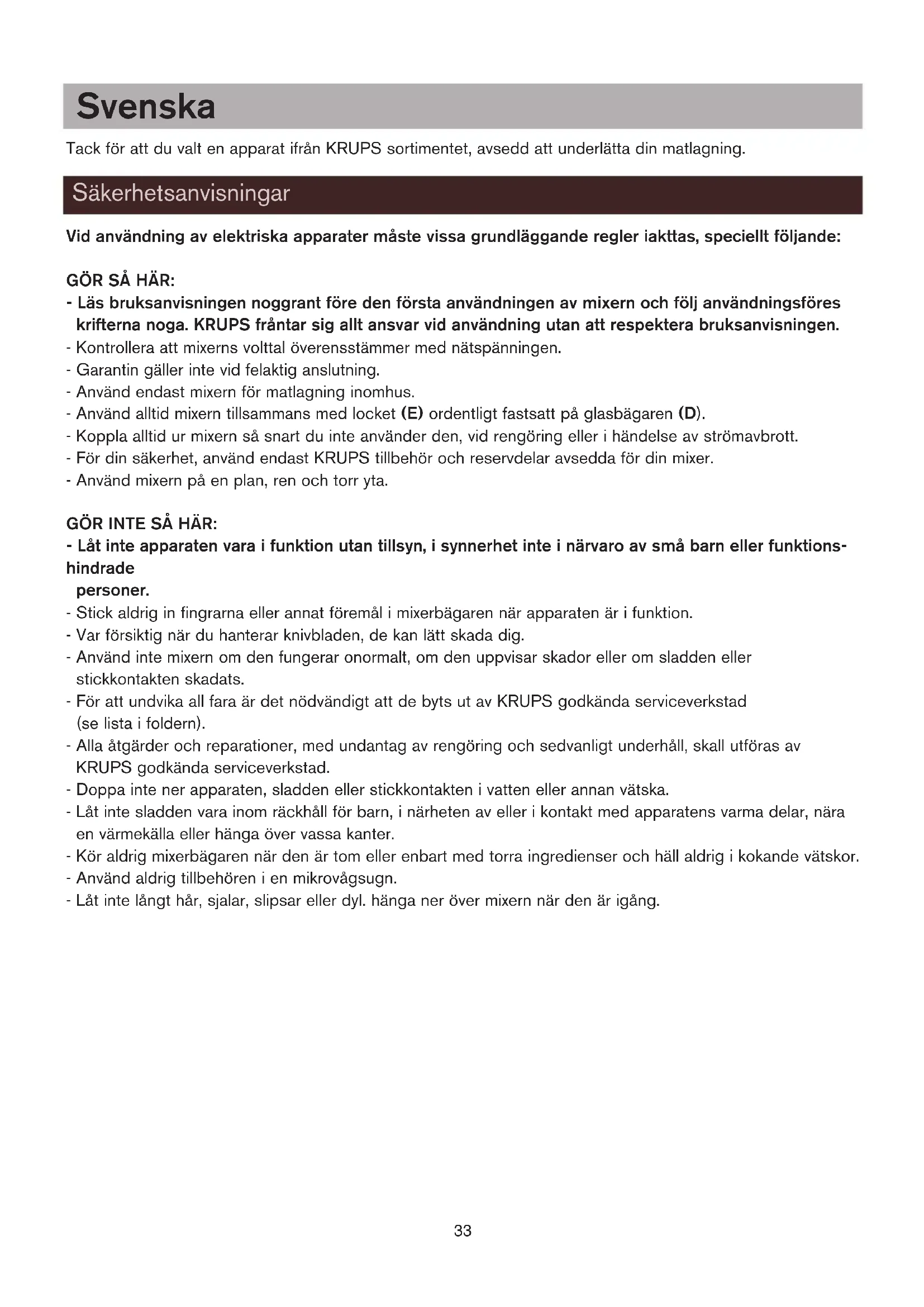 1 eller 2 3 eller 4 5 sek. Med impulser 30 sek. Med impulser Med impulser Rengøring Hvis blenderen ikke fungerer? Genbrug Vi skal alle være med til at beskytte miljøet! Apparatet indeholder mange materialer, der kan genvindes eller genbruges. Bring det til et specialiseret indsamlingssted for genbrug eller et autoriseret serviceværksted, når det ikke skal bruges mere. notice* 6/04/06 14:27 Page 3233 Svenska Tack för att du valt en apparat ifrån KRUPS sortimentet, avsedd att underlätta din matlagning. Vid användning av elektriska apparater måste vissa grundläggande regler iakttas, speciellt följande: GÖR SÅ HÄR: - Läs bruksanvisningen noggrant före den första användningen av mixern och följ användningsföres krifterna noga. KRUPS fråntar sig allt ansvar vid användning utan att respektera bruksanvisningen. - Kontrollera att mixerns volttal överensstämmer med nätspänningen. - Garantin gäller inte vid felaktig anslutning. - Använd endast mixern för matlagning inomhus. - Använd alltid mixern tillsammans med locket (E) ordentligt fastsatt på glasbägaren (D). - Koppla alltid ur mixern så snart du inte använder den, vid rengöring eller i händelse av strömavbrott. - För din säkerhet, använd endast KRUPS tillbehör och reservdelar avsedda för din mixer. - Använd mixern på en plan, ren och torr yta. GÖR INTE SÅ HÄR: - Låt inte apparaten vara i funktion utan tillsyn, i synnerhet inte i närvaro av små barn eller funktions- hindrade personer. - Stick aldrig in fingrarna eller annat föremål i mixerbägaren när apparaten är i funktion. - Var försiktig när du hanterar knivbladen, de kan lätt skada dig. - Använd inte mixern om den fungerar onormalt, om den uppvisar skador eller om sladden eller stickkontakten skadats. - För att undvika all fara är det nödvändigt att de byts ut av KRUPS godkända serviceverkstad (se lista i foldern). - Alla åtgärder och reparationer, med undantag av rengöring och sedvanligt underhåll, skall utföras av KRUPS godkända serviceverkstad. - Doppa inte ner apparaten, sladden eller stickkontakten i vatten eller annan vätska. - Låt inte sladden vara inom räckhåll för barn, i närheten av eller i kontakt med apparatens varma delar, nära en värmekälla eller hänga över vassa kanter. - Kör aldrig mixerbägaren när den är tom eller enbart med torra ingredienser och häll aldrig i kokande vätskor. - Använd aldrig tillbehören i en mikrovågsugn. - Låt inte långt hår, sjalar, slipsar eller dyl. hänga ner över mixern när den är igång. Säkerhetsanvisningar notice* 6/04/06 14:27 Page 3334 Beskrivning av mixern A Metallsockel B Kontrollpanel för val av hastighet b1 – stoppknapp b2 – hastighet Slow (långsam hastighet) b3 – hastighet 1 b4 – hastighet 2 b5 – hastighet 3 b6 – hastighet 4 b7 – funktion Ice Cruch (krossad is) b8 – funktion Vari-Pulse C Sladdförvaring D Mixerbägare d1 Bas för låsning d2 Avtagbar knivhållare d3 Fog d4 Graderad glasbägare 1,75 l E Lock mixerbägare F Måttkopp 75 ml G Tillbehör kvarn (finns på godkända serviceverkstäder) Viktigt: Se till att locket på mixerbägaren (E), försett med måttkoppen (F), är ordentligt fastsatt på mixerbä garen (D) - Starta aldrig apparaten på den högsta hastigheten. - Öka alltid hastigheten gradvis. - Låt apparaten stanna fullständigt innan du tar av mixerbägaren eller tillbehören. - För en bekvämare användning eller vid förvaring, kan du minska sladdens längd genom att föra in den i metallsockeln (A) genom hålet beläget på baksidan (C) (bild 1). - Diska mixerbägaren, locket, måttkoppen och kvarntillbehöret i varmt vatten med lite diskmedel, före den första användningen. Skölj och torka dem noggrant.