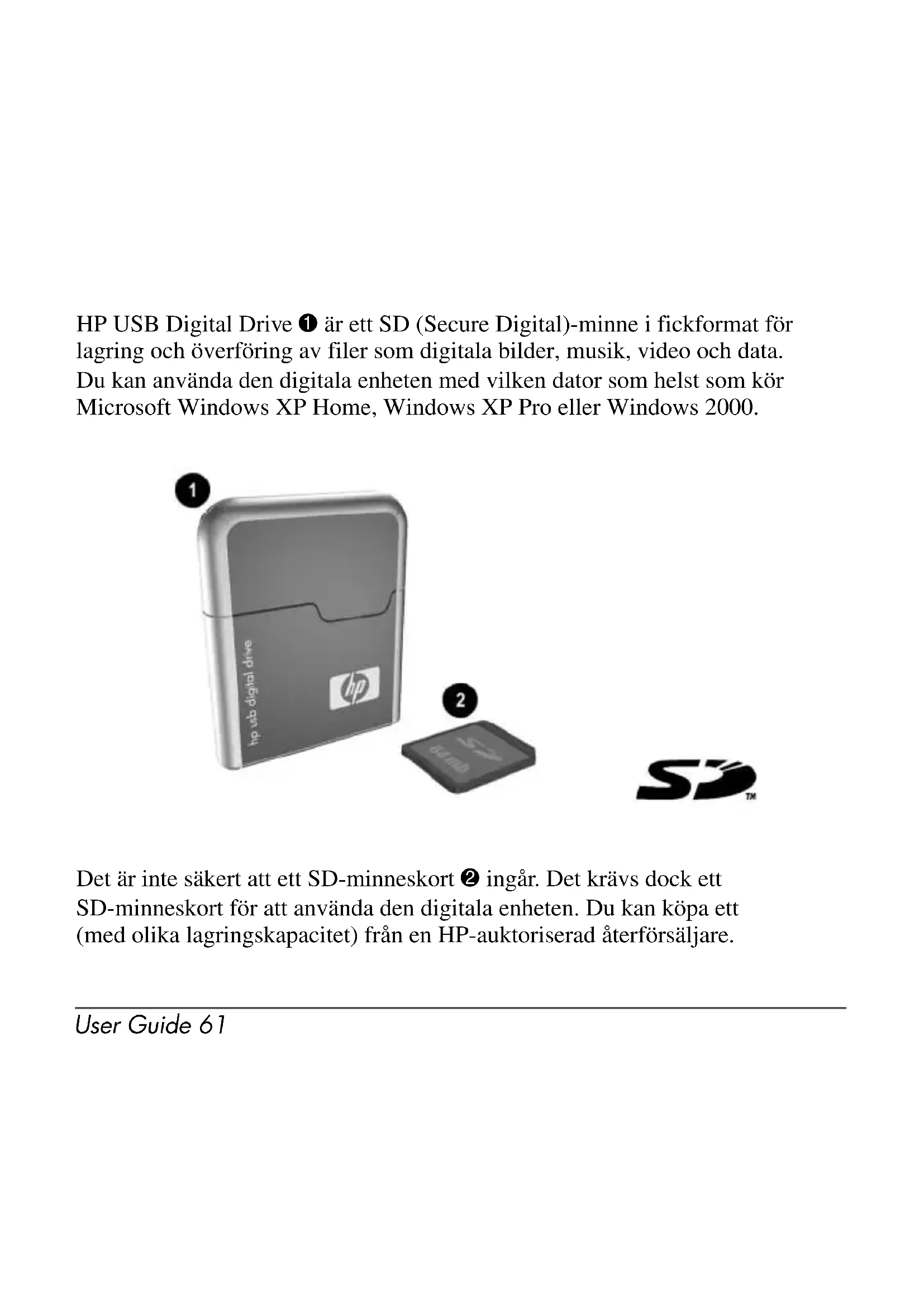 Försök inte att dra ut SD-minneskortet när statuslampan på den digitala enheten blinkar. » När du har kopplat bort den digitala enheten från datorn drar du försiktigt ut SD-minneskortet från den digitala enheten.70 User Guide Få teknisk support Supporttjänster är tillgängliga på Internet via HP:s tekniska support. Du kan bläddra igenom meddelanden som gäst eller registrera dig som användare och ställa egna frågor. HP besvarar frågor inom kort. Du får åtkomst till HP:s tekniska support genom att gå till HP:s webbplats http://www.hp.com och välja ditt land eller område. När du ringer teknisk support bör du ha följande tillgängligt: ■ HP USB Digital Drive ■ Förhållandena under vilka felet uppstod ■ Eventuella felmeddelanden som visats ■ Maskinvara och program som du använderUser Guide 7172 User GuideUser Guide 7374 User G u i d eUser Guide 7576 User Guid eUser Guide 77 ✎78 User GuideUser Guide 7980 User GuideUser Guide 8182 User GuideUser Guide 8384 User GuideUser Guide 8586 User GuideUser Guide 8788 User GuideUser Guide 8990 User GuideUser Guide 9192 User GuideUser Guide 9394 User GuideUser Guide 9596 User GuideUser Guide 9798 User GuideUser Guide 99100 User GuideUser Guide 101102 User GuideUser Guide 103104 User GuideUser Guide 105106 User GuideUser Guide 107108 User GuideUser Guide 109110 User Guide© 2003 Hewlett-Packard Development Company, L.P. Microsoft and Windows are trademarks of Microsoft Corporation in the U.S. and/or other countries. SD Logo is a trademark. The information contained herein is subject to change without notice. The warranties for HP products and services are set forth in the express warranty statements accompanying such products and services. HP shall not be liable for technical or editorial errors or omissions contained herein. User Guide HP USB Digital Drive First Edition July 2003