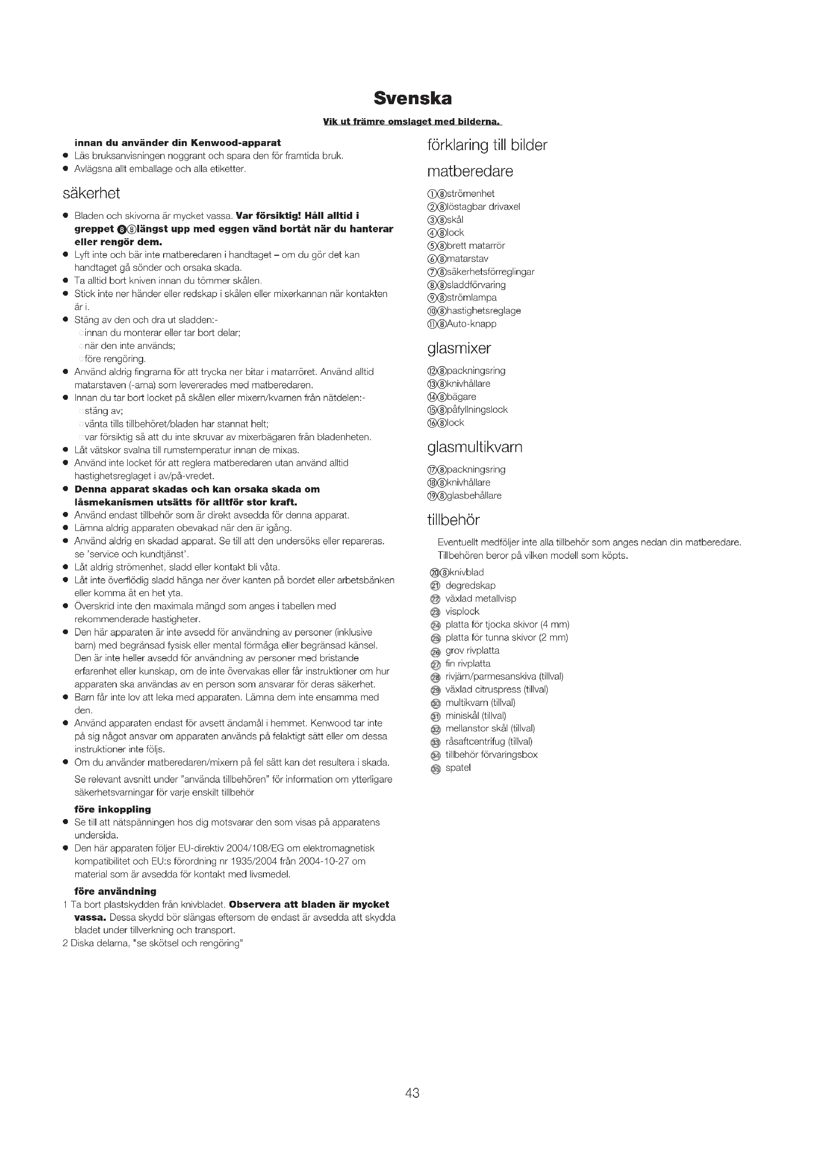 Den här apparaten följer EU-direktiv 2004/108/EG om elektromagnetisk kompatibilitet och EU:s förordning nr 1935/2004 från 2004-10-27 om material som är avsedda för kontakt med livsmedel. före användning 1 Ta bort plastskydden från knivbladet. Observera att bladen är mycket vassa. Dessa skydd bör slängas eftersom de endast är avsedda att skydda bladet under tillverkning och transport. 2 Diska delarna, "se skötsel och rengöring" förklaring till bilder matberedare strömenhet löstagbar drivaxel skål lock brett matarrör matarstav säkerhetsförreglingar sladdförvaring ! strömlampa " hastighetsreglage # Auto-knapp glasmixer $ packningsring % knivhållare & bägare ' påfyllningslock ( lock glasmultikvarn ) packningsring