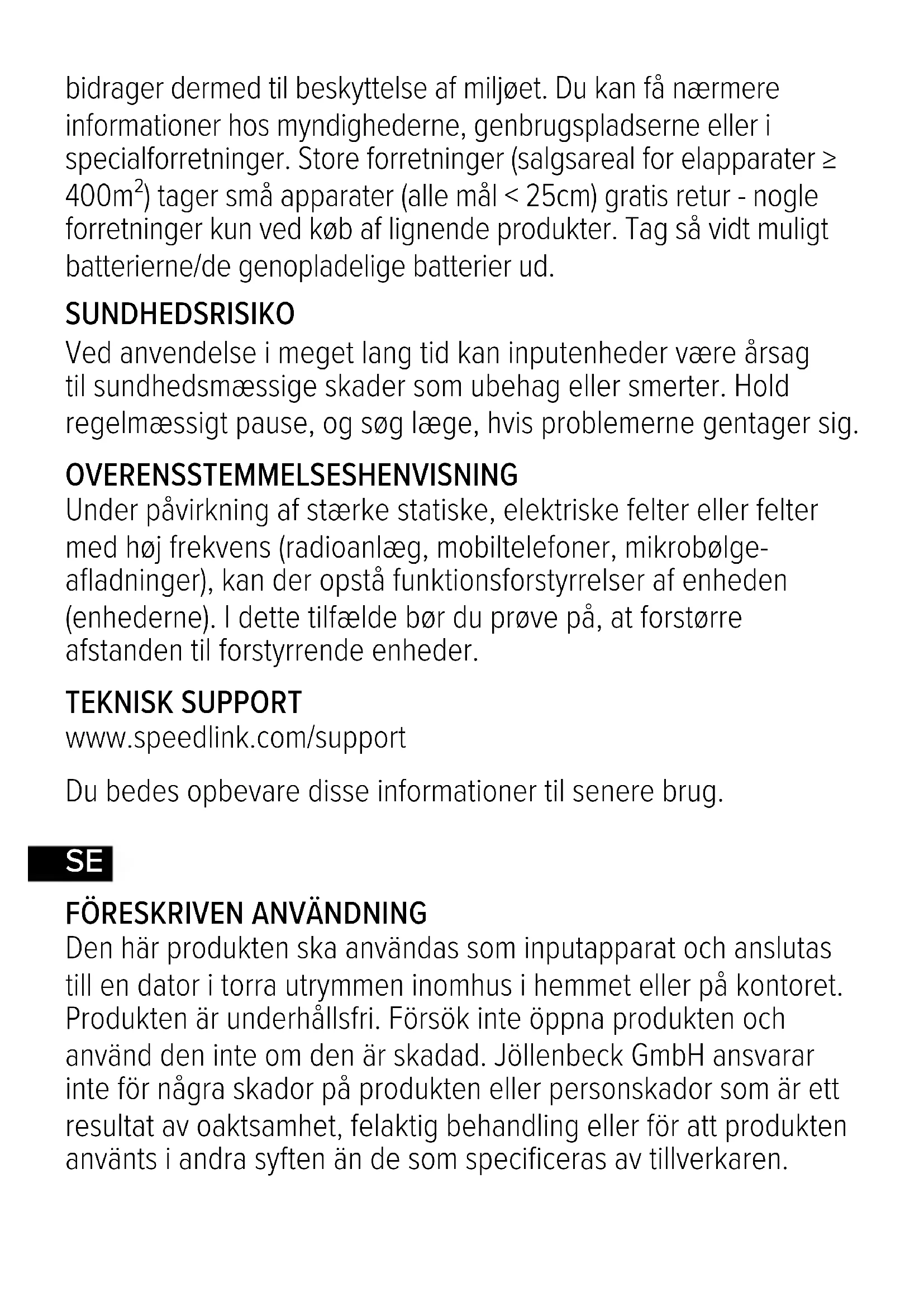Den här produkten ska användas som inputapparat och anslutas till en dator i torra utrymmen inomhus i hemmet eller på kontoret. Produkten är underhållsfri. Försök inte öppna produkten och använd den inte om den är skadad. Jöllenbeck GmbH ansvarar inte för några skador på produkten eller personskador som är ett resultat av oaktsamhet, felaktig behandling eller för att produkten använts i andra syften än de som specificeras av tillverkaren.SE KASSERING Den här symbolen betyder att produkten inte får slängas bland de vanliga hushållssoporna. Gamla apparater eller batterier kan innehålla farliga ämnen som skadar miljön och/eller människors hälsa. Att förvara eller kassera dem på fel sätt kan leda till påföljder enligt gällande lag. Det kostar ingenting att lämna in dem till ett allmänt insamlingsställe, vilket man också är skyldig till enligt lag. På så sätt garanteras att den här typen av produkter kasseras, återvinns eller återanvänds korrekt och på ett sätt som gynnar miljön. Information finns hos myndigheter, återvinningsanläggningar och specialistföretag. Stora butiker (≥ 400m² säljyta för elektriska apparater) tar emot mindre produkter (alla mått < 25cm) kostnadsfritt, mindre butiker bara när man köper likvärdiga produkter. Ta helst ut batterierna HÄLSORISKER Att använda inputapparater extremt länge kan leda till problem med hälsan, t ex obehag eller smärtor. Lägg in regelbundna pauser och konsultera en läkare om problemen återkommer.