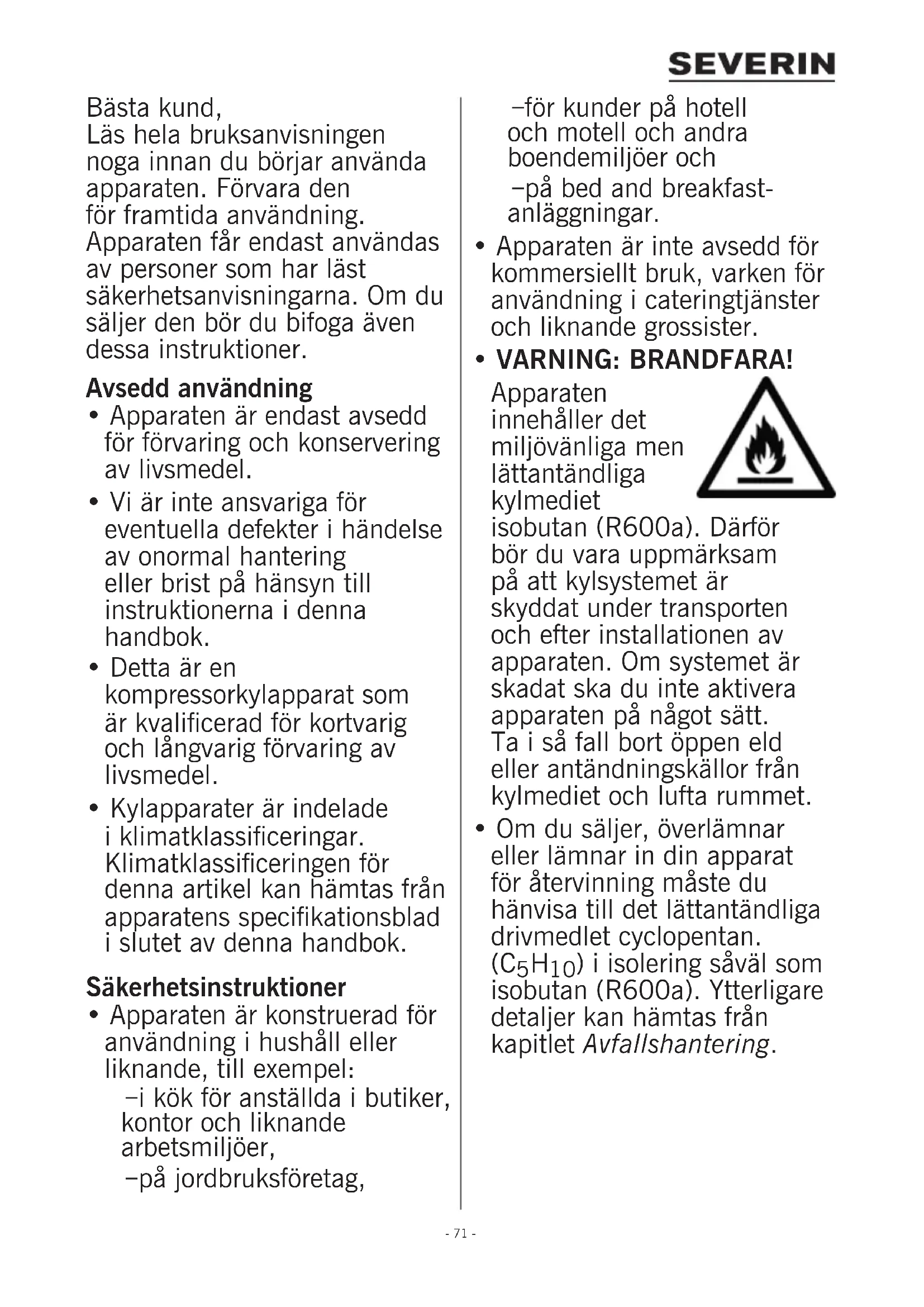 - VARNING: BRANDFARA! Apparaten innehåller det miljövänliga men lättantändliga kylmediet isobutan (R600a). Därför bör du vara uppmärksam på att kylsystemet är skyddat under transporten och efter installationen av apparaten. Om systemet är skadat ska du inte aktivera apparaten på något sätt. Ta i så fall bort öppen eld eller antändningskällor från kylmediet och lufta rummet.