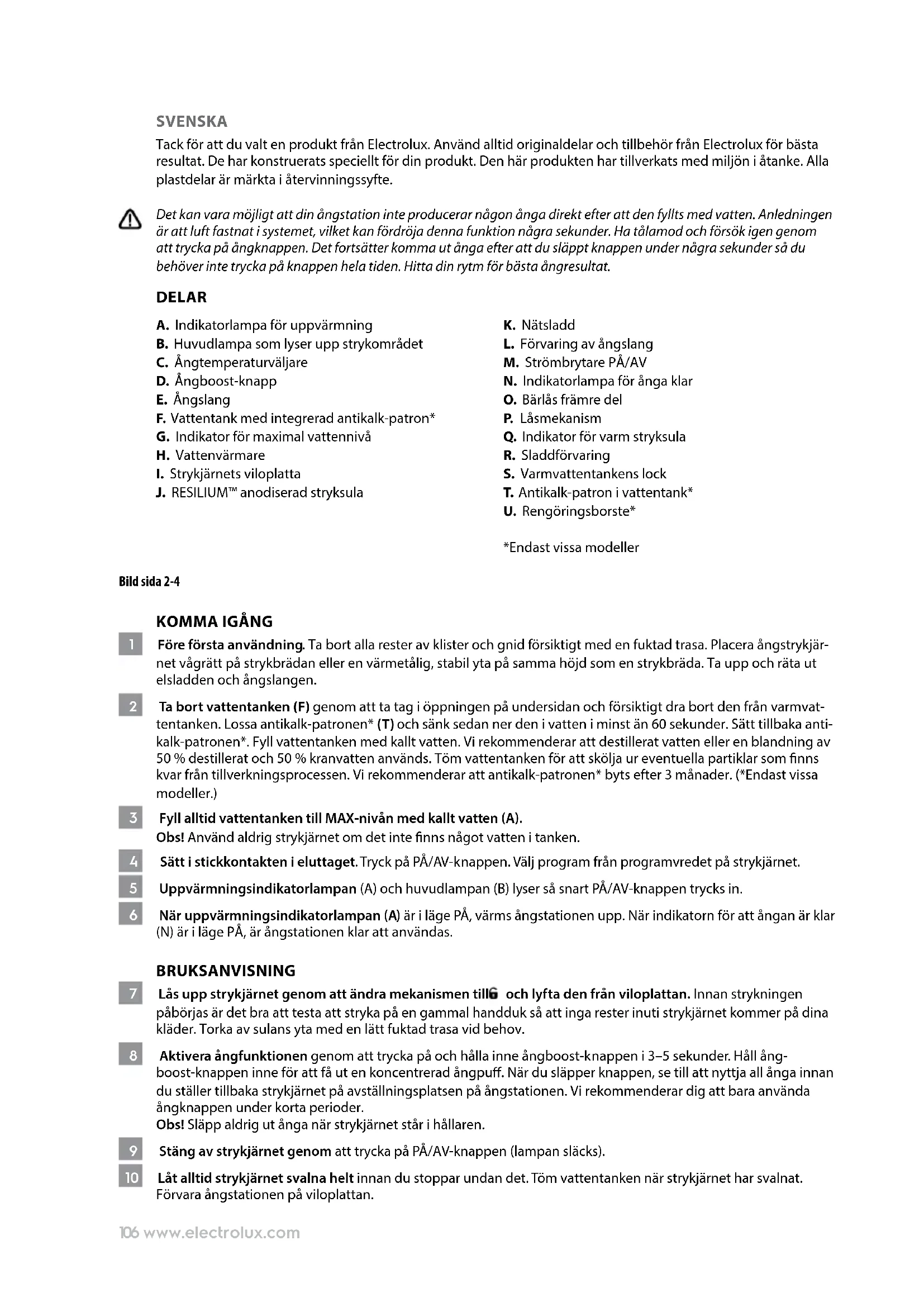 Данный символ на изделии означает, что оно содержит батарею, которую запрещается выбрасывать вместе с бытовым мусором. Данный символ на изделии или его упаковке указывает, что изделие нельзя утилизировать как обычные бытовые отходы. Для вторичной переработки изделия просим отнести его в официальный пункт сбора или в сервисный центр Electrolux, где батарея и электрические компоненты будут извлечены и переработаны безопасным и профессиональным образом. Следуйте правилам, установленным в вашей стране для раздельного сбора электроприборов и аккумуляторных батарей. Electrolux оставляет за собой право вносить изменения в свои товары, информацию о них и спецификации без уведомления.106 www.electrolux.com SVENSKA Tack för att du valt en produkt från Electrolux. Använd alltid originaldelar och tillbehör från Electrolux för bästa resultat. De har konstruerats speciellt för din produkt. Den här produkten har tillverkats med miljön i åtanke. Alla plastdelar är märkta i återvinningssyfte. Det kan vara möjligt att din ångstation inte producerar någon ånga direkt efter att den fyllts med vatten. Anledningen är att luft fastnat i systemet, vilket kan fördröja denna funktion några sekunder. Ha tålamod och försök igen genom att trycka på ångknappen. Det fortsätter komma ut ånga efter att du släppt knappen under några sekunder så du behöver inte trycka på knappen hela tiden. Hitta din rytm för bästa ångresultat. DELAR A. Indikatorlampa för uppvärmning B. Huvudlampa som lyser upp strykområdet C. Ångtemperaturväljare D. Ångboost-knapp E. Ångslang F. Vattentank med integrerad antikalk-patron* G. Indikator för maximal vattennivå H. Vattenvärmare