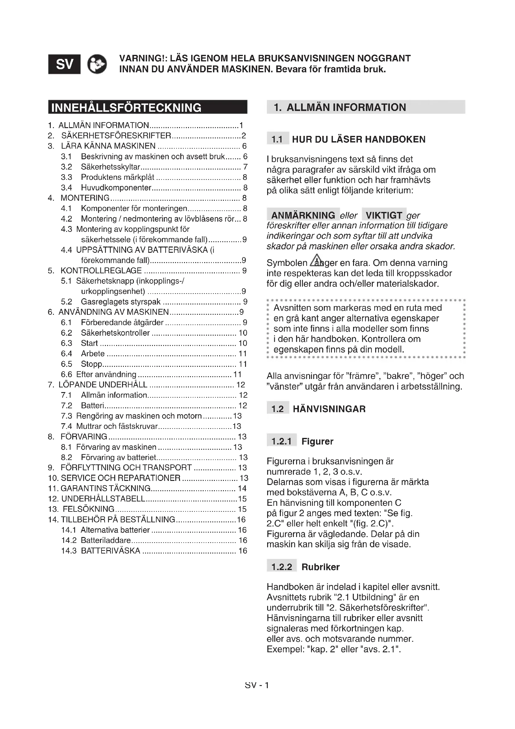 skadade delar. Byt skadade komponenter om det behövs och dra eventuellt åt lösa skruvar och bultar eller kontakta en auktoriserad serviceverkstad.SV - 12 VIKTIGT Ta alltid bort batteriet (avs.