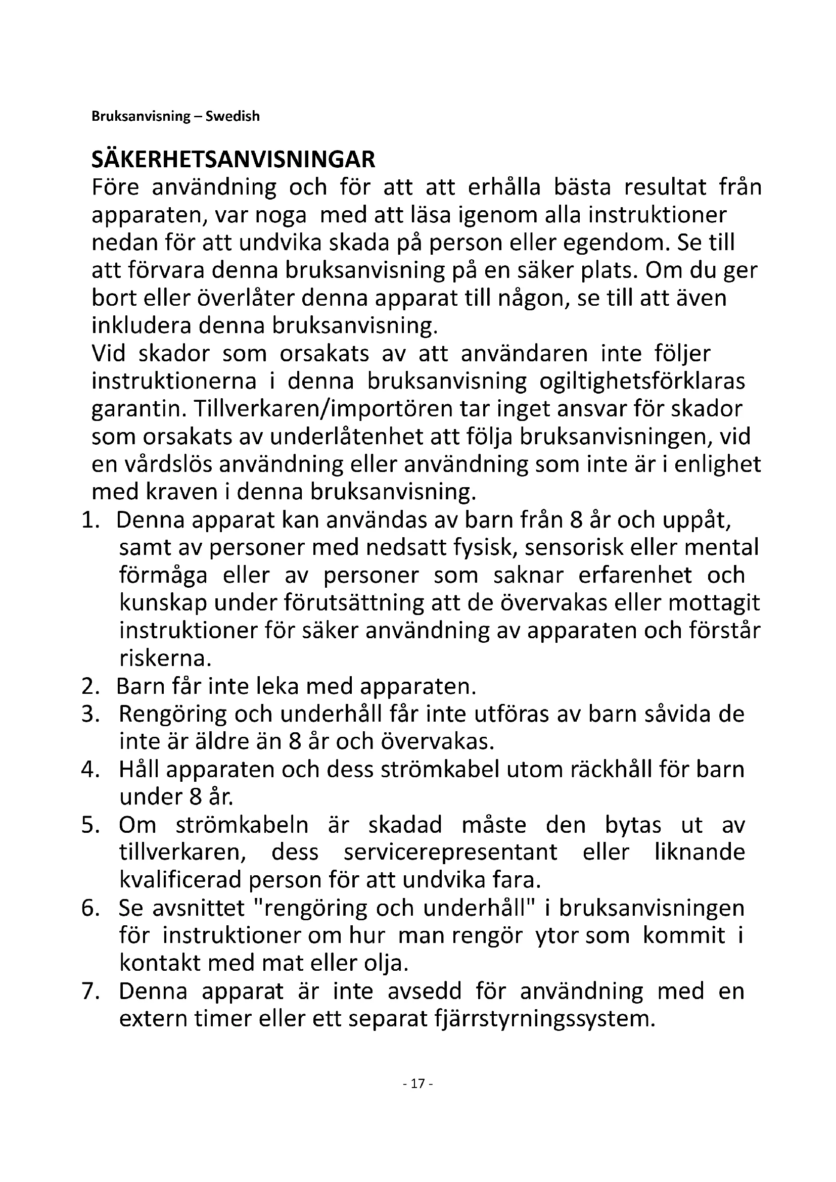 17. Lämna aldrig apparaten obevakad vid användning.