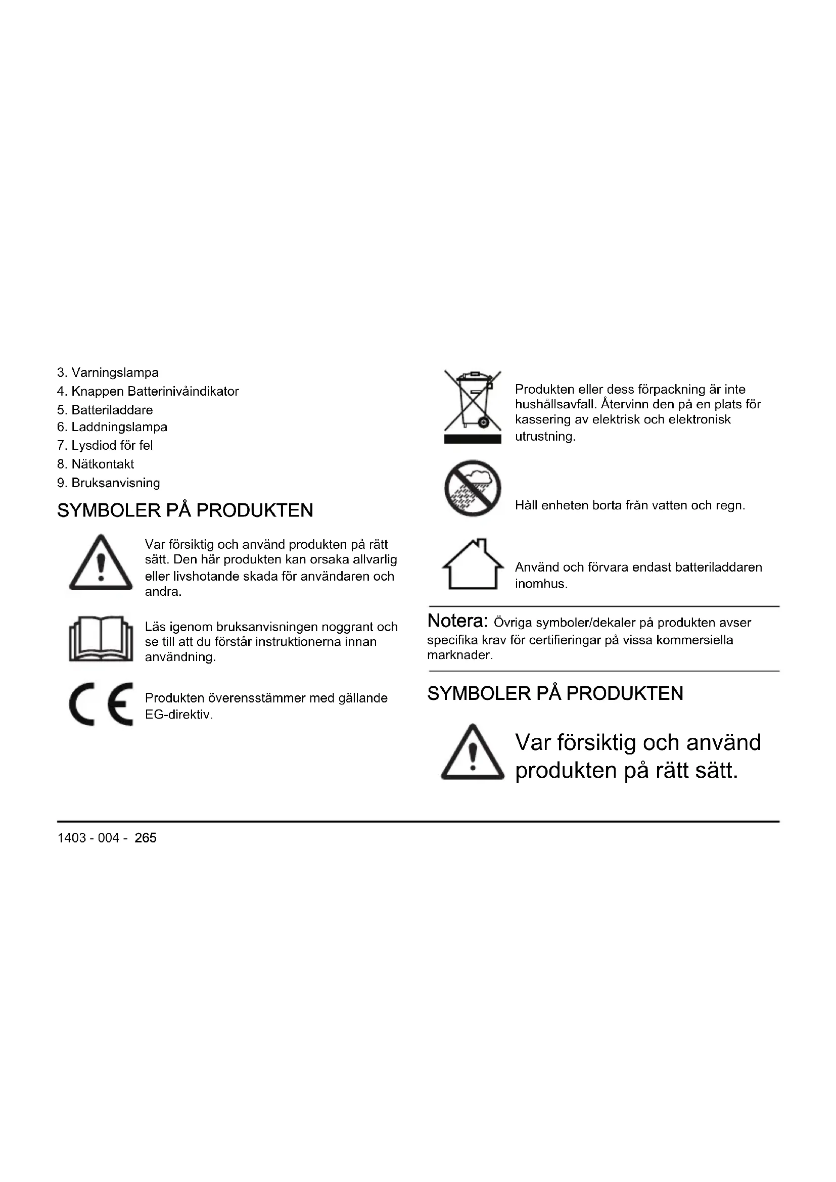 Var försiktig och använd produkten på rätt sätt. Den här produkten kan orsaka allvarlig eller livshotande skada för användaren och andra. Läs igenom bruksanvisningen noggrant och se till att du förstår instruktionerna innan användning. Produkten överensstämmer med gällande EG-direktiv. Produkten eller dess förpackning är inte hushållsavfall. Återvinn den på en plats för kassering av elektrisk och elektronisk utrustning. Håll enheten borta från vatten och regn. Använd och förvara endast batteriladdaren inomhus. Notera: Övriga symboler/dekaler på produkten avser specifika krav för certifieringar på vissa kommersiella marknader.