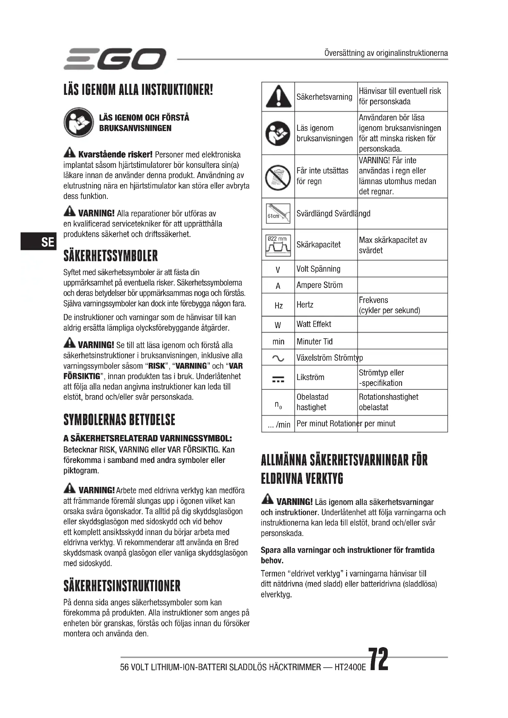 ELDRIVNA VERKTYG VARNING! Läs igenom alla säkerhetsvarningar och instruktioner. Underlåtenhet att följa varningarna och instruktionerna kan leda till elstöt, brand och/eller svår personskada.Spara alla varningar och instruktioner för framtida behov.Termen “eldrivet verktyg” i varningarna hänvisar till ditt nätdrivna (med sladd) eller batteridrivna (sladdlösa) elverktyg.Översättning av originalinstruktionerna56 VOLT LITHIUM-ION-BATTERI SLADDLÖS HÄCKTRIMMER — HT2400E
