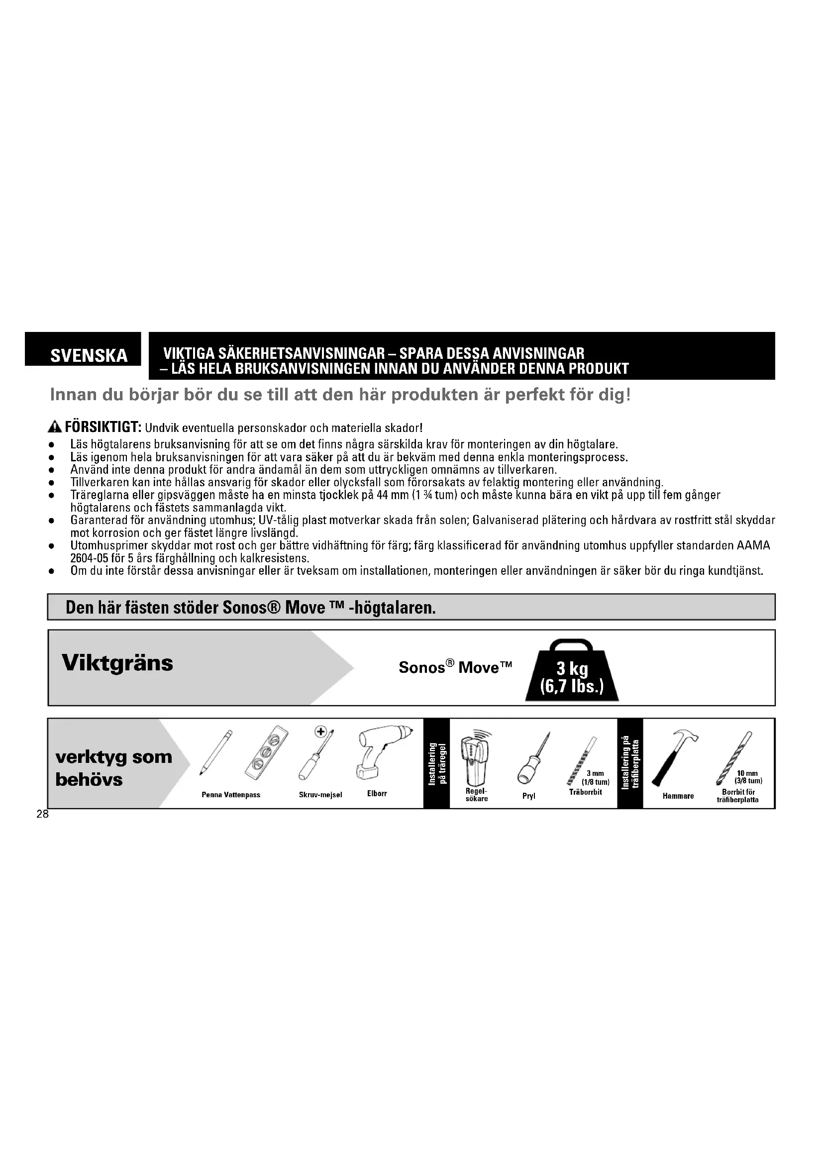 MOETEN stevig vastgezet zijn zodat de wandplaat niet kan bewegen. Zorg ervoor dat wandplaat stevig aan de wand is bevestigd voordat u verder gaat met de volgende stap. pagina 9 pagina 7 pagina 527 NEDERLANDS NEDERLANDS De wandmontage aan de luidspreker bevestigen Page 11 STAP 2 OPMERKING: De Sonos® MOVE™-luidspreker en het Sonos® Move™-oplaadstation zijn NIET INBEGREPEN. OPMERKING: Het Sonos® Move™-oplaadstation is OPTIONEEL verkrijgbaar en wordt ALLEEN aangeraden voor montage binnenshuis. Om te verwijderen Page 14 Bezoek Sanus.com/2910 voor een handige installatievideo. TIP: Stel uw Sonos®-luidspreker in alvorens deze aan de beugel te bevestigen. Bijgeleverde onderdelen en materialen Page 1128 SVENSKA VIKTIGA SÄKERHETSANVISNINGAR – SPARA DESSA ANVISNINGAR – LÄS HELA BRUKSANVISNINGEN INNAN DU ANVÄNDER DENNA PRODUKT Den här fästen stöder Sonos® Move ™ -högtalaren. ● Läs högtalarens bruksanvisning för att se om det finns några särskilda krav för monteringen av din högtalare. ● Läs igenom hela bruksanvisningen för att vara säker på att du är bekväm med denna enkla monteringsprocess. ● Använd inte denna produkt för andra ändamål än dem som uttryckligen omnämns av tillverkaren. ● Tillverkaren kan inte hållas ansvarig för skador eller olycksfall som förorsakats av felaktig montering eller användning. ● Träreglarna eller gipsväggen måste ha en minsta tjocklek på 44 mm (1 ¾ tum) och måste kunna bära en vikt på upp till fem gånger högtalarens och fästets sammanlagda vikt. ● Garanterad för användning utomhus; UV-tålig plast motverkar skada från solen; Galvaniserad plätering och hårdvara av rostfritt stål skyddar mot korrosion och ger fästet längre livslängd. ● Utomhusprimer skyddar mot rost och ger bättre vidhäftning för färg; färg klassificerad för användning utomhus uppfyller standarden AAMA 2604-05 för 5 års färghållning och kalkresistens. ● Om du inte förstår dessa anvisningar eller är tveksam om installationen, monteringen eller användningen är säker bör du ringa kundtjänst. Innan du börjar bör du se till att den här produkten är perfekt för dig! FÖRSIKTIGT: Undvik eventuella personskador och materiella skador! Viktgräns 3 kg (6,7 lbs.) Sonos
