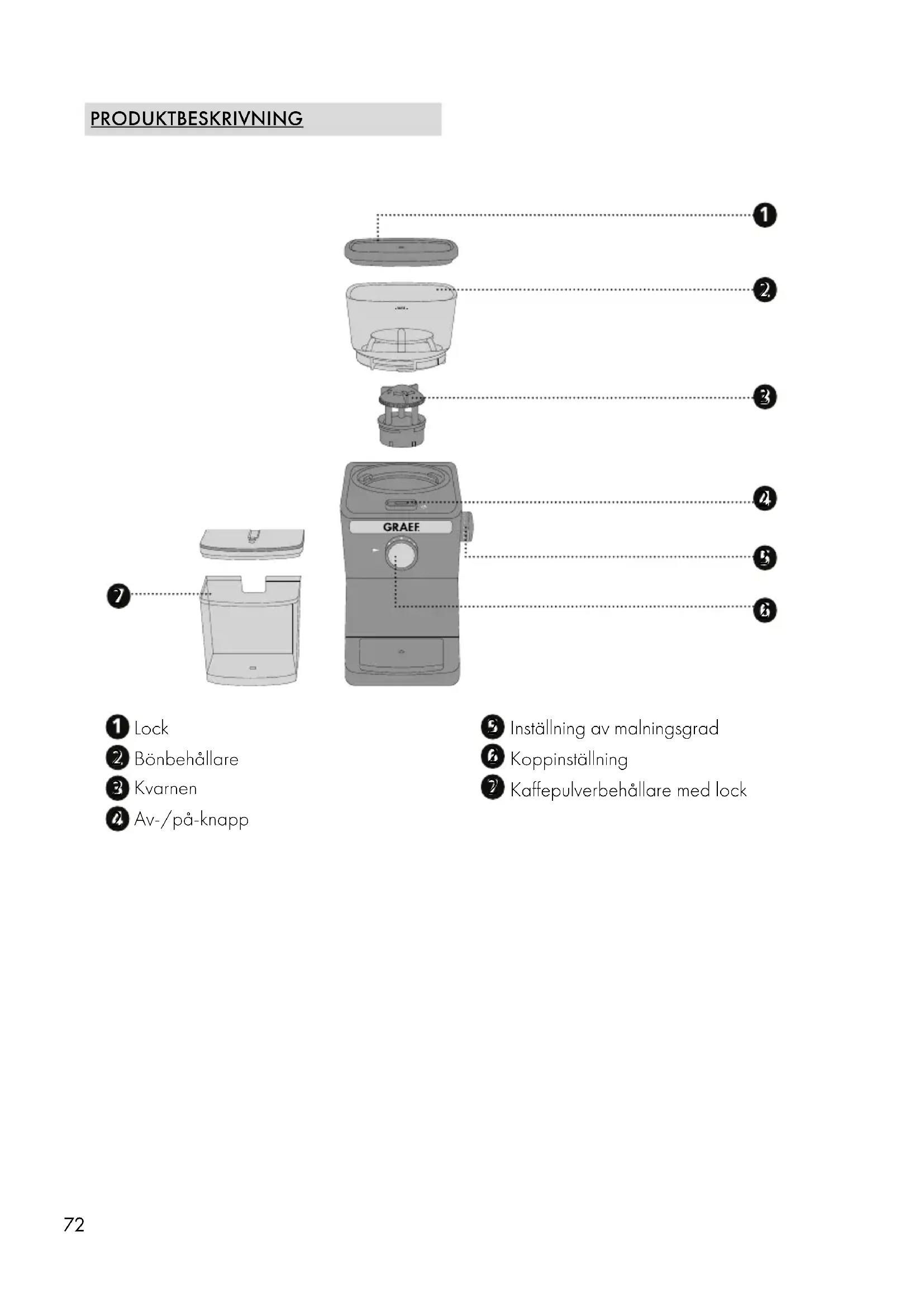 UKR FÖRORD Kära kund, med köpet av den här kaffekvarnen har du gjort ett bra val. Du har köpt en erkänd kvalitets- produkt. Vi tackar dig för ditt köp och önskar dig mycket nöje med din nya kaffekvarn från Graef.