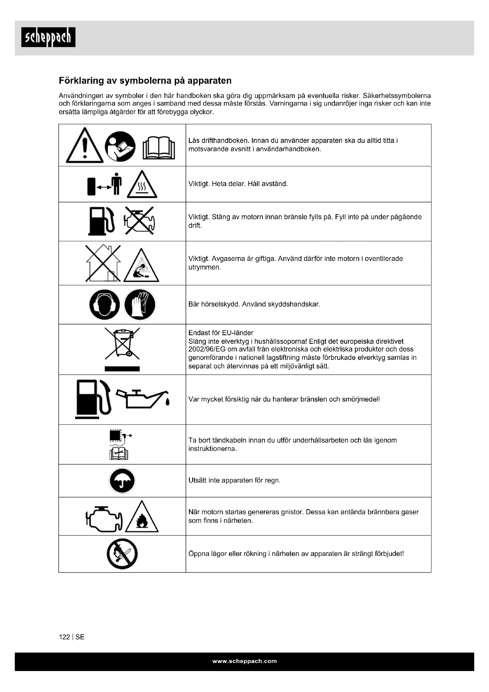 Förklaring av symbolerna på apparaten Användningen av symboler i den här handboken ska göra dig uppmärksam på eventuella risker. Säkerhetssymbolerna och förklaringarna som anges i samband med dessa måste förstås. Varningarna i sig undanröjer inga risker och kan inte ersätta lämpliga åtgärder för att förebygga olyckor. Läs drifthandboken. Innan du använder apparaten ska du alltid titta i motsvarande avsnitt i användarhandboken. Viktigt. Heta delar. Håll avstånd. Viktigt. Stäng av motorn innan bränsle fylls på. Fyll inte på under pågående drift. Viktigt. Avgaserna är giftiga. Använd därför inte motorn i oventilerade utrymmen. Bär hörselskydd. Använd skyddshandskar. Endast för EU-länder Släng inte elverktyg i hushållssoporna! Enligt det europeiska direktivet 2002/96/EG om avfall från elektroniska och elektriska produkter och dess genomförande i nationell lagstiftning måste förbrukade elverktyg samlas in separat och återvinnas på ett miljövänligt sätt. Var mycket försiktig när du hanterar bränslen och smörjmedel! Ta bort tändkabeln innan du utför underhållsarbeten och läs igenom instruktionerna. Utsätt inte apparaten för regn. När motorn startas genereras gnistor. Dessa kan antända brännbara gaser som nns i närheten. Öppna lågor eller rökning i närheten av apparaten är strängt förbjudet!www.scheppach.com