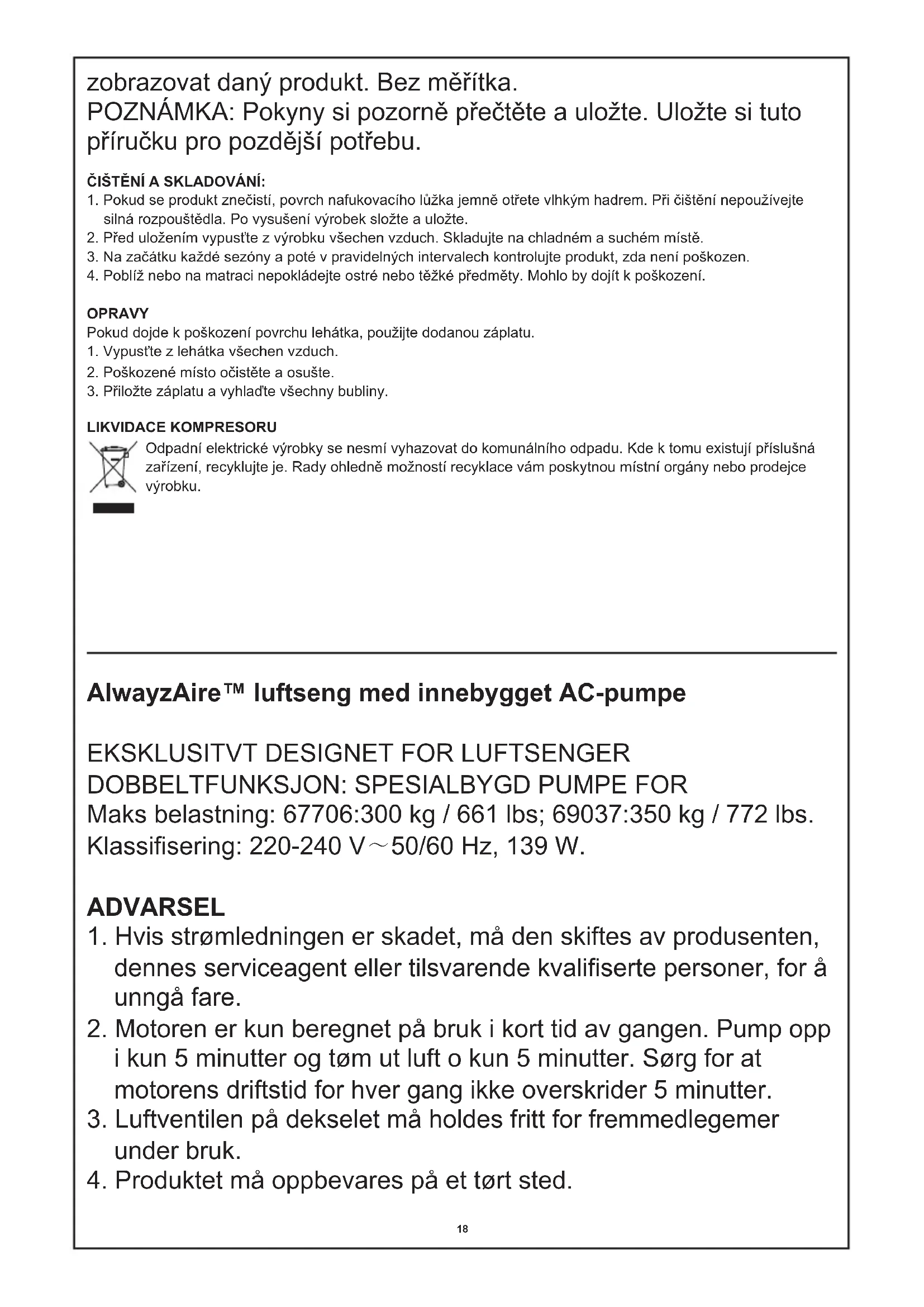 KASTA BORT PUMPEN: Elektroniska produkter ska inte kastas tillsammans med hushållsavfall. Lämna in till en återvinningscentral. Kontrollera med din lokala myndighet eller återförsäljare angående återvinning. 23Nafukovacia matrac AlwayzAire™ so zabudovanou pumpičkou AC