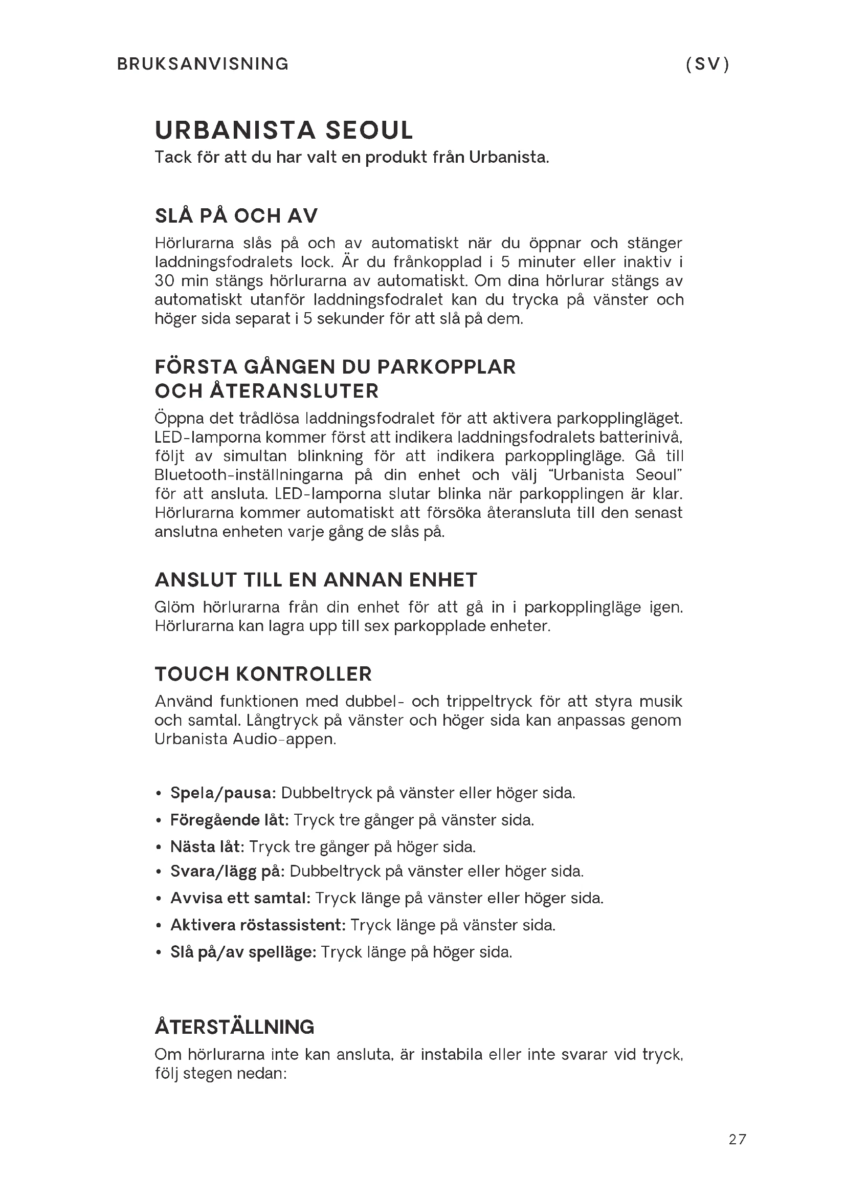 (PL)27 BRUKSANVISNING (SV) URBANISTA SEOUL Tack för att du har valt en produkt från Urbanista.