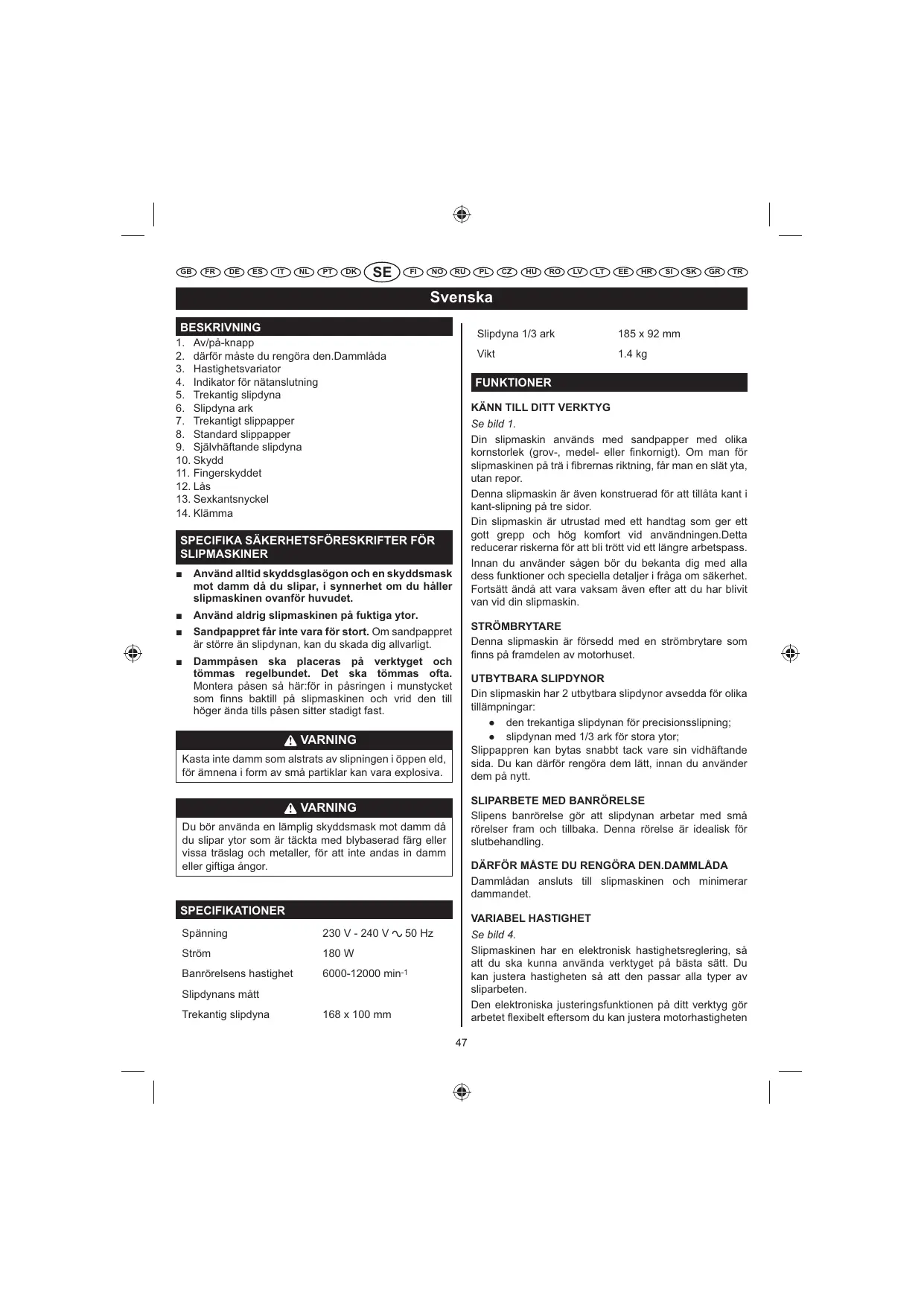 Slipens banrörelse gör att slipdynan arbetar med små rörelser fram och tillbaka. Denna rörelse är idealisk för slutbehandling. VARNING Du bör använda en lämplig skyddsmask mot damm då du slipar ytor som är täckta med blybaserad färg eller vissa träslag och metaller, för att inte andas in damm eller giftiga ångor. DÄRFÖR MÅSTE DU RENGÖRA DEN.DAMMLÅDA Dammlådan ansluts till slipmaskinen och minimerar dammandet. SPECIFIKATIONER VARIABEL HASTIGHET Spänning 230 V - 240 V Ström 180 W 50 Hz Banrörelsens hastighet 6000-12000 min-1 Se bild 4. Slipmaskinen har en elektronisk hastighetsreglering, så att du ska kunna använda verktyget på bästa sätt. Du kan justera hastigheten så att den passar alla typer av sliparbeten. Den elektroniska justeringsfunktionen på ditt verktyg gör arbetet Èexibelt eftersom du kan justera motorhastigheten Slipdynans mått Trekantig slipdyna Slipdyna 1/3 ark 168 x 100 mm
