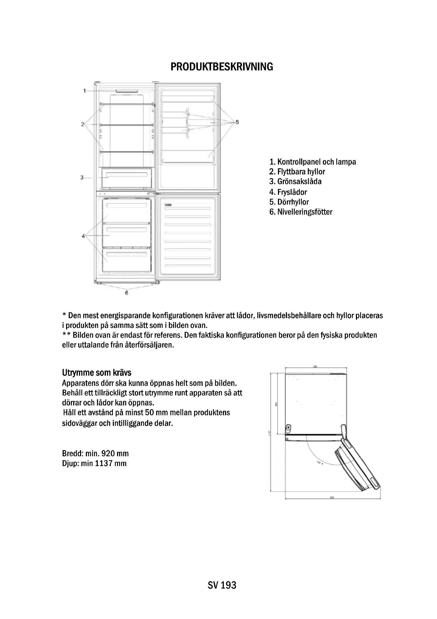 - Den mest energisparande konfigurationen kräver att lådor, livsmedelsbehållare och hyllor placeras i produkten på samma sätt som i bilden ovan. ** Bilden ovan är endast för referens. Den faktiska konfigurationen beror på den fysiska produkten eller uttalande från återförsäljaren. Utrymme som krävs Apparatens dörr ska kunna öppnas helt som på bilden. Behåll ett tillräckligt stort utrymme runt apparaten så att dörrar och lådor kan öppnas. Håll ett avstånd på minst 50 mm mellan produktens sidoväggar och intilliggande delar. Bredd: min. 920 mm Djup: min 1137 mmSV 194 ANVÄNDNING ➀ PÅ/AV-knappen används för att slå på/av apparaten. ➁ Mode-knappen används för att välja kylskåpstemperatur eller specialfunktioner som. ➂ Wi-Fi-ikonen visar om apparaten är ansluten till appen. ➃ Super Cool-ikonen visar om funktionen är aktiverad. ➄ Temperaturnivåerna visar kylskåpets valda temperatur. Användning