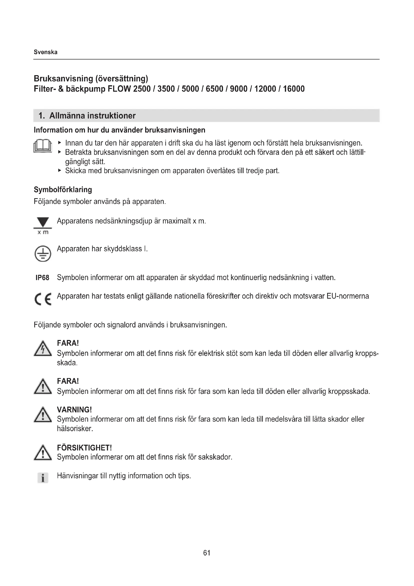 gängligt sätt. ▶ Skicka med bruksanvisningen om apparaten överlåtes till tredje part. Symbolförklaring Följande symboler används på apparaten. Apparatens nedsänkningsdjup är maximalt x m. Apparaten har skyddsklass I. Symbolen informerar om att apparaten är skyddad mot kontinuerlig nedsänkning i vatten. Apparaten har testats enligt gällande nationella föreskrifter och direktiv och motsvarar EU-normerna Följande symboler och signalord används i bruksanvisningen. FARA! Symbolen informerar om att det nns risk för elektrisk stöt som kan leda till döden eller allvarlig kropps