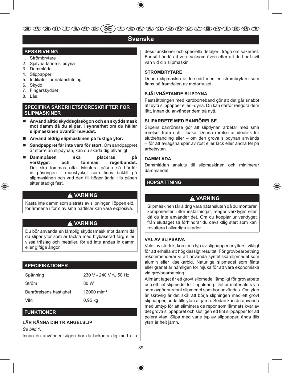 GB FR DE ES IT NL PT DK SE FI NO RU PL CZ HU RO LV LT EE HR SI SK GR TR Svenska BESKRIVNING 1. 2. 3. 4. 5. 6. 7. 8.