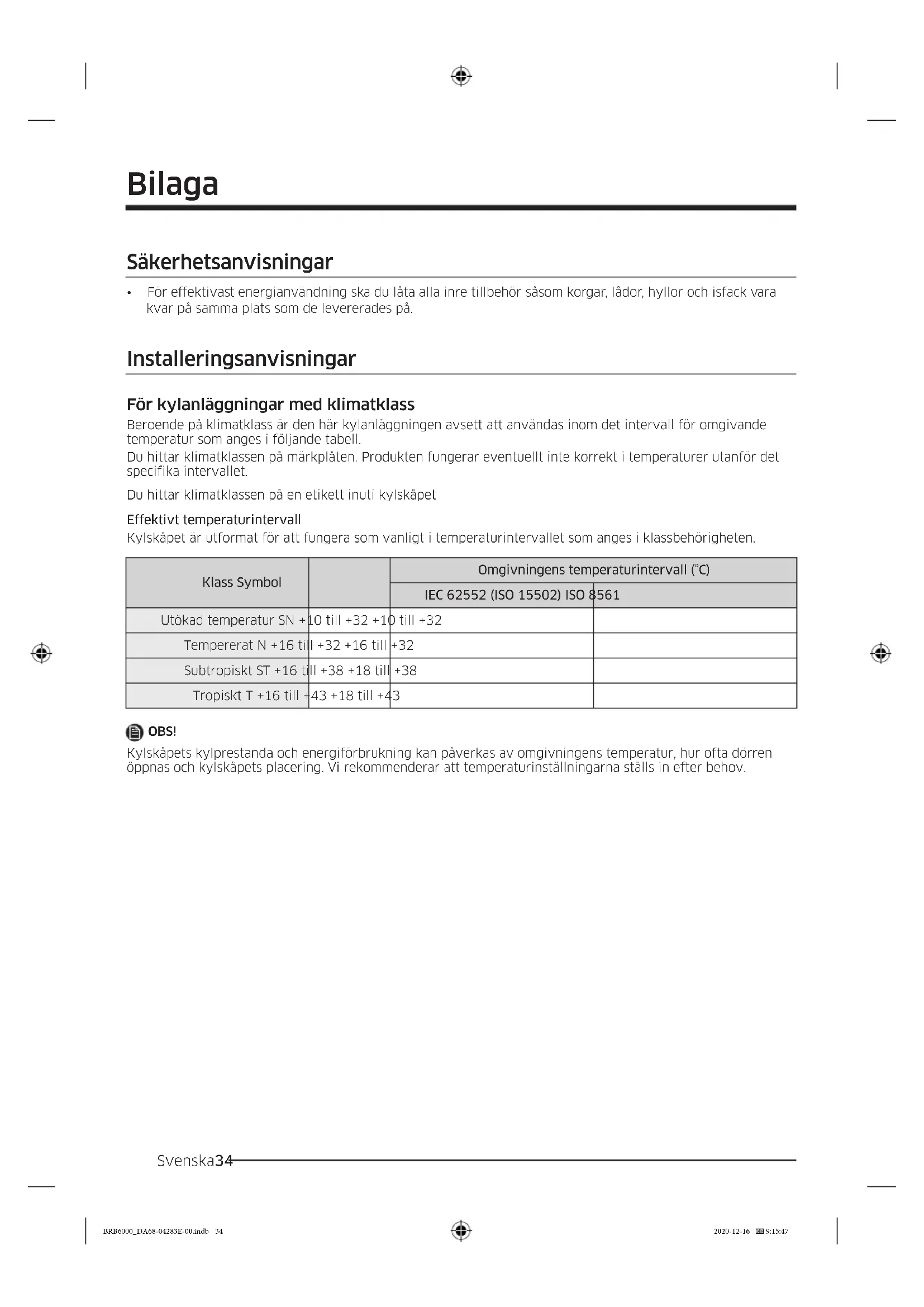 Utökad temperatur SN +10 till +32 +10 till +32 Tempererat N +16 till +32 +16 till +32 Subtropiskt ST +16 till +38 +18 till +38 Tropiskt T +16 till +43 +18 till +43 OBS! Kylskåpets kylprestanda och energiförbrukning kan påverkas av omgivningens temperatur, hur ofta dörren öppnas och kylskåpets placering. Vi rekommenderar att temperaturinställningarna ställs in efter behov. BRB6000_DA68-04283E-00.indb 34 2020-12-16 9:15:47Svenska 35 Temperaturanvisningar Rekommenderad temperatur Optimal temperatur för lagring av livsmedel: